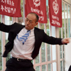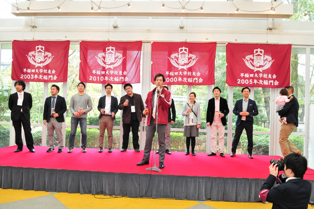 各年次稲門会会長11名が舞台の上に。1人11秒の威勢のよいあいさつが続きます。盛大な乾杯の声が会場に響き渡り、パーティーが始まりました。