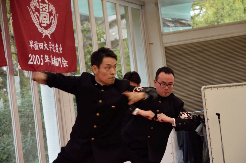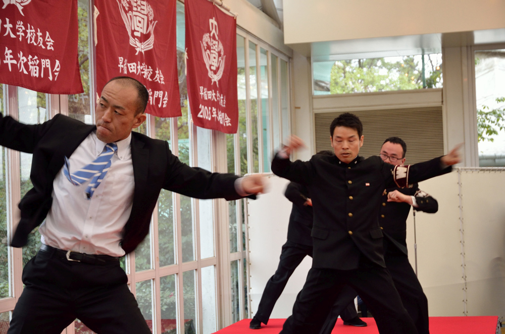 最後はおなじみの校歌・応援歌の斉唱。ステージの上では、各年次の応援部OBが迫力ある演舞を披露します。全員で腕を高らかに振り上げて歌うエネルギーは、若手年次稲門会ならではの迫力。学生時代のような空気に包まれます。次なる大イベント・稲門祭の告知にワクワクしたまま、一同は2次会会場へ。大盛り上がりの一日となりました。