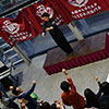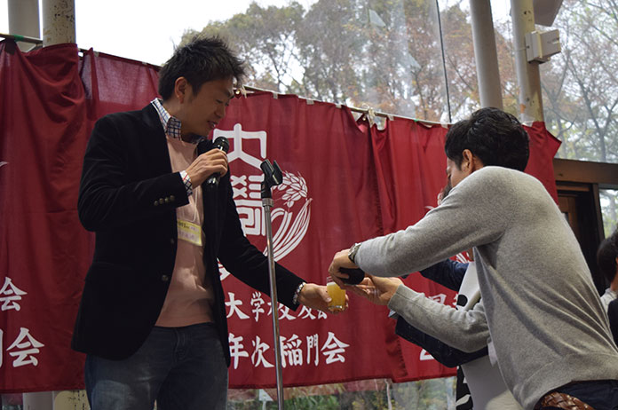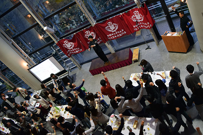 最後はおなじみの校歌・応援歌の斉唱。ステージの上では、各年次の応援部OBが迫力ある演舞を披露しました。音楽がかかると全員が腕を高らかに上げ、校歌、『紺碧の空』の大合唱。学生時代のような空気に包まれました。閉会後、一同は年次ごとに分かれ、2次会会場へ。大盛り上がりの一日となりました。
