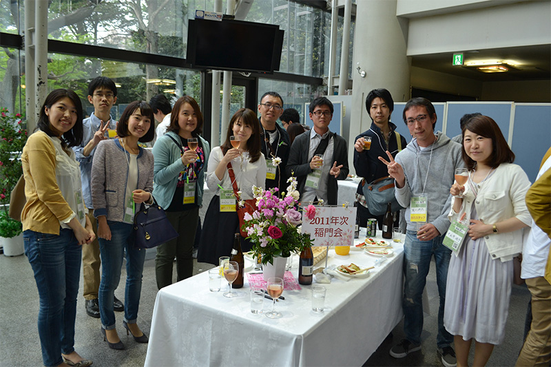 各年次稲門会会長がステージ上に集まり、一人ずつ紹介。その後2009年次稲門会会長が乾杯の音頭を取り、お酒と軽食を手に歓談が始まりました。