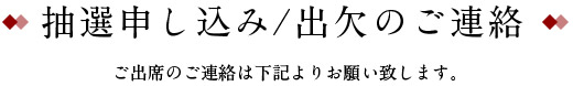 | 申込 | 〈卒業後45年目、50年目の方〉 抽選申込・出欠ハガキを郵送、またはウェブサイトからお申し込みください。 抽選申込締切 : 9月7日(木) 抽選申込をご希望の場合、当選された方に入場指定席券を郵送いたします。 ※応募は個人(卒業後45・50年目の校友ご本人)のみ受け付けます。 複数名の申し込みはできません。 抽選申し込みされた方全員に抽選結果を郵送いたします。 〈卒業後35年目、25年目、15年目の方〉 出欠ハガキを郵送、またはウェブサイトからお申し込みください。 |