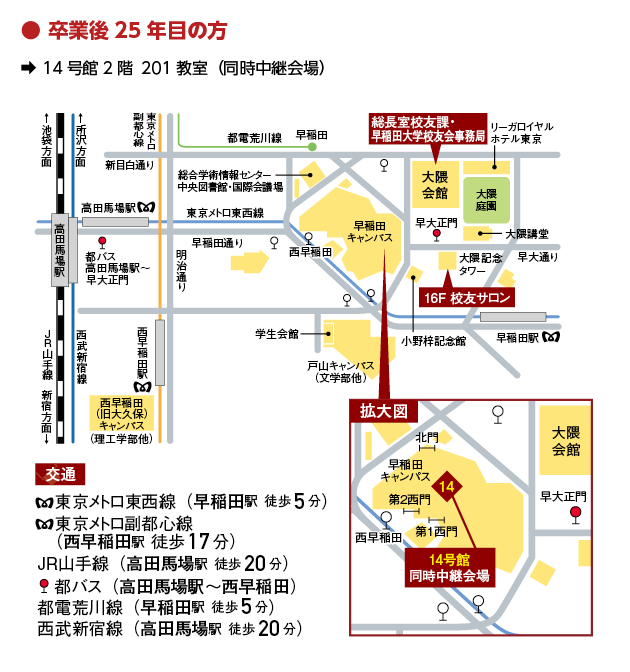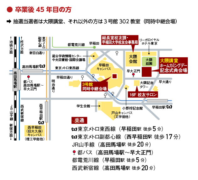 大隈講堂の座席数が限られるため、式典参加は卒業後45年目・50年目の方から抽選による入場とさせていただき、入場いただけない方は、同時中継会場で式典の模様をご覧いただきます。