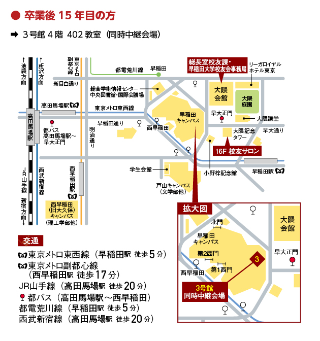大隈講堂の座席数が限られるため、式典参加は卒業後45年目・50年目の方から抽選による入場とさせていただき、入場いただけない方は、同時中継会場で式典の模様をご覧いただきます。