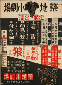 大正 13 年(1924)6 月、この新劇初の専門劇場および劇団である、築地小劇場が誕生しました。新劇の父ともよばれる小山内薫を軸に生まれたこの劇団は、実験的な公演を次々に手掛け、数々の優れた作品を世に生み出しました。また、役者や劇作家、スタッフなど多くの人材が築地小劇場で育ち、戦前から戦後の新劇界を支えた人々を輩出もしました。新劇史上、伝説的な存在です。