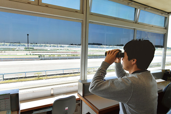 最大周回2,000メートルに及ぶセンター内の調教馬場で、走行する所属馬を双眼鏡で確認する