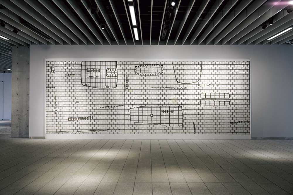 戸山キャンパスには、彫刻家辻晉堂(1910~1981)のレリーフ作品5点が設置されている。旧33号館高層棟ピロティ部(1階の柱のみの外構空間)の壁面を飾っていたのが、この白いタイルレリーフ。縦2.350メートル、横5.660メートルの大きな作品であったことから、そのままの状態で切り取ることが難しく、二つに切断して新棟に再設置された。