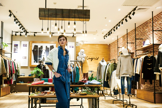 MARK STYLERの代表的なブランドの一つ「Ungrid(アングリッド)」北京1号店。「A New Class Casual」をブランドコンセプトにし、2018年の開店以降、高感度の顧客層に向けた服を提案している。開店時には店頭でショーを行い、中国の人気モデルなども招待して話題となった。(P.17写真)