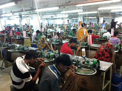 うだるような暑さのバングラデシュのニット工場(12年)。熟練の技術を要する精緻な手作業と、近代的な刺しゅう機が混在している
