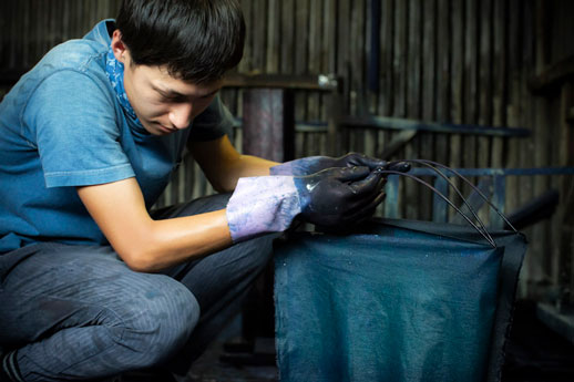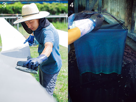 日本人の衣服を彩ってきた、美しき藍の色。相澤択哉さんは、入念な作業で藍を染め上げていく。