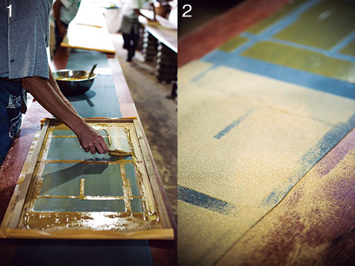 しるしが付けられた生地は付着している油などが洗い落とされる(精練)。その後、紋や模様を切り抜いた型紙を、木枠に張った紗(薄い網状の織物)にニスや接着剤で固定し、それを「しるし」にしたがって生地に置いて、上からもち粉と糠でつくった糊を塗る(写真1)。型紙のある部分は生地に糊が付かないので、染めた際に色が付き、糊の付いた部分は白抜きになる。さらに、糊を塗った箇所にはおがくずをまぶし補強する(写真2)。染める際に、糊が剝がれ落ちたりしないようにするためだ。