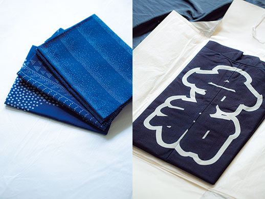 相澤染工場でつくられたものあいの「藍染ハンカチ」(写真左)と、紺半纏(写真右)