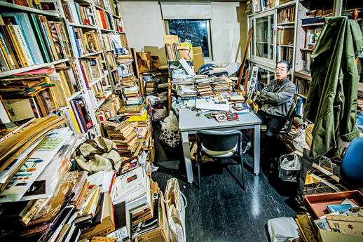 2000年に理工学部の教授となり、2004年から国際教養学部の教壇に立つ樋口先生にとって、ここは早稲田で三番目の研究室。部屋を移るたびにダンボール70箱以上もの本を処分しているにもかかわらず、再び本で埋め尽くされていくのは「興味と研究の幅が広いため」。本棚には、古本屋で見つけた色あせた文庫本から、英語やドイツ語の専門書までさまざまな分野の本が並び、手前に見える本の後ろに、さらに1列収められている。これだけあると目的の本を探すのも難しそうだが、先生は「場所は全て頭に入っている」という。
