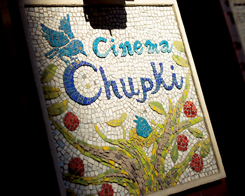 入り口横にあるモザイクタイルでデザインされたChupkiの看板。目が見えない方でも触って分かるように配慮されている