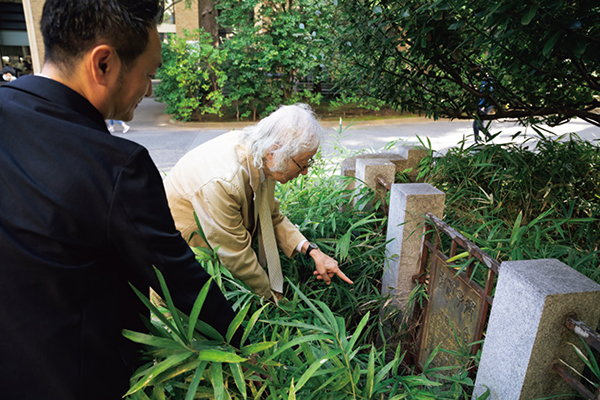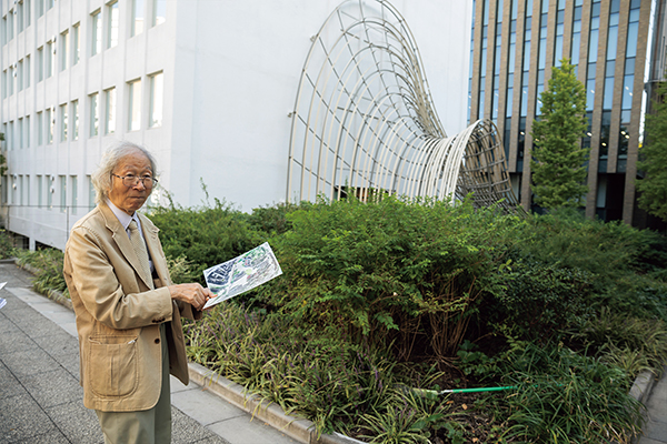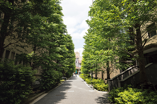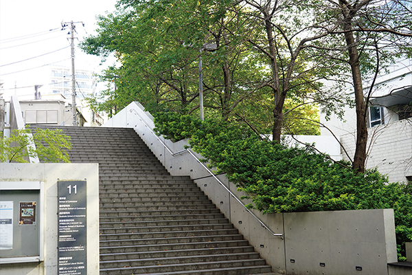 西門へと続く11号館と14号館の間の階段脇にも樹木や草花が植えられている。「11号館と14号館の間は、昔は12号館と13号館の間で公道だったんだ。左右にサクラ並木があって、詩にうたわれたほどだった。当時、この辺りは理工学部ゾーンでした」(藪野)