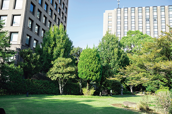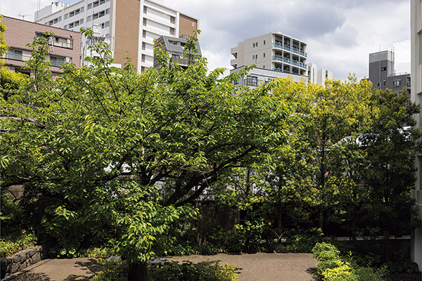 階段を下りた場所にも植物が豊かな場所がある。「実は国際文学館を作る時に、あまり人が来なかったこの場所も休憩できるように整備したんです。植栽も考えて、中央のサトザクラをシンボルツリーにしました」(高橋)