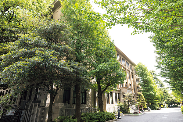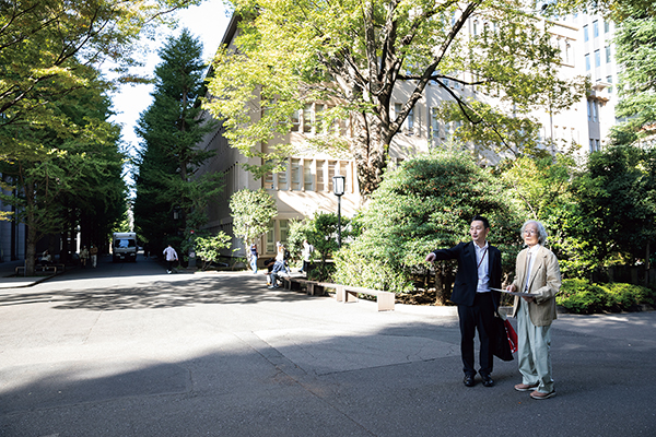 正門からすぐ、大きなイチョウ並木がある1号館前。「昭和の初め、この建物ができた時に移植されたものだと思う。それから変わってないから背が高い」(藪野)「3号館、8号館の周りのイチョウは、建て替え工事の際に一度移植しているので、比べるとまだ少し小さいです」(高橋)