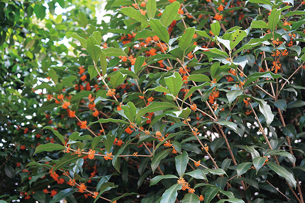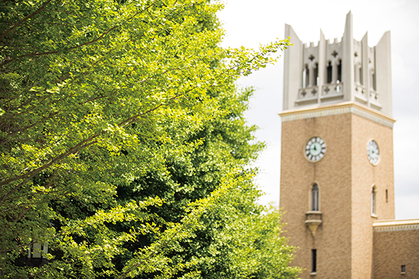 南門から少し戻り通用門を通ると、2号館の横にはキンモクセイが香る。「早稲田は四季がそれぞれ美しいと初めて来た時も思いました。例えば大隈講堂横のイチョウは秋に黄金色に輝く時があるけど、1週間くらいしか見られないから貴重なんです」(藪野)