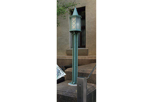 「會津八一記念博物館」の前の街灯にも注目ポイントが。「花といえばここも見てみてください。大隈家の家紋が裏梅剣花菱(うらうめけんはなびし)なので、こういう花の意匠が実はいろんなところにあるんですよ」(藪野)