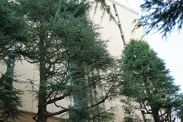 8号館前をはじめ、早稲田キャンパスには多くのヒマラヤスギがある。「ヒマラヤスギは早稲田キャンパスの植物を語る上で欠かせない。大きいですね」(藪野)