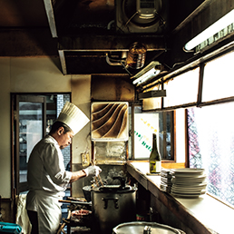 揚げ物とフライパン調理を巧みに並行するのも先代譲りの技だが、身のこなしは軽やかだ。カウンターの上に置かれた瓶入りの酒をサッとフライパンに入れて調理していく