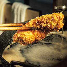 「カツカレー」用の薄手のかつ。じっくり火を通す厚手のかつと違い、短時間で揚がる分、逆に絶妙な手際が求められる。食感は衣はサクサク、肉はしっとり