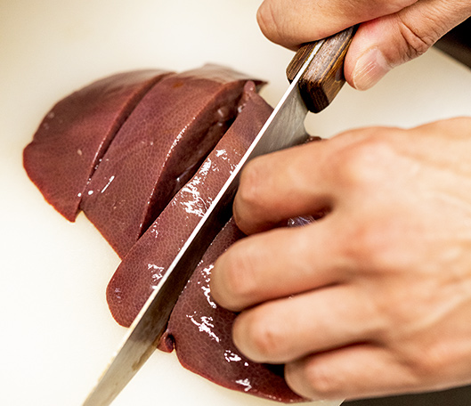 美しい豚のレバーに包丁を入れると音がするかのようにスパッと切れる。生きがいい、プリプリのレバーが食欲をそそる。