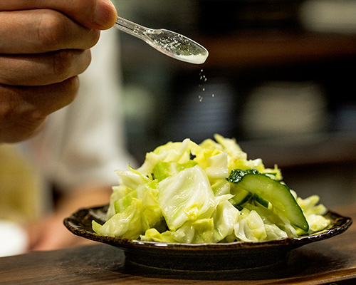 お通しはおしんこだ。塩漬けのキャベツとキュウリはシャキシャキと心地いいかみ応え。小皿に山盛りという気前のよさがまたうれしい。