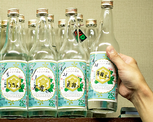 常連さんの名前が書かれた、キンミヤ焼酎のキープボトル。割りものにはレモンソーダのほかに、ホッピーやバイスなどもある。