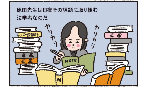 原田 それが、早い段階から法曹三者(検察官・裁判官・弁護士)は考えてはおらず……。もちろん素晴らしい仕事ですし、尊敬する方もたくさんいますが、やはり私自身は研究に魅力を感じました。研究者は弁護士のように、トラブルに巻き込まれた人を個別に救うことはできません。でも、研究の成果が形になったらの話ではありますが、それによって縁の下から社会を底上げし、その問題で困る人がいない社会構造へと少しずつ近づけていくことができる。それも、研究という仕事の魅力だと思っています。