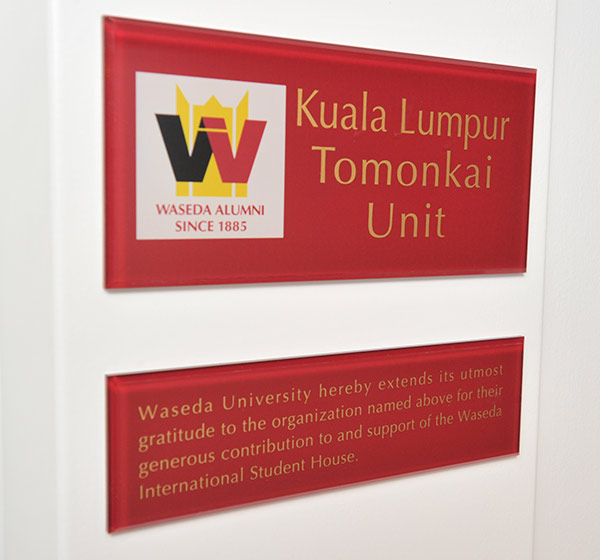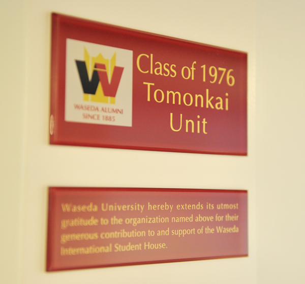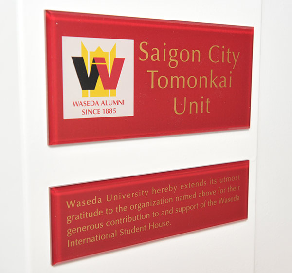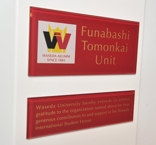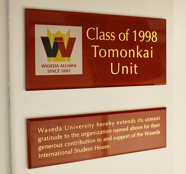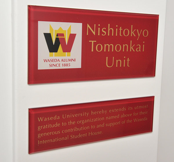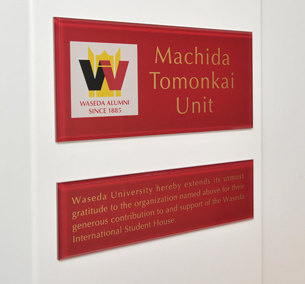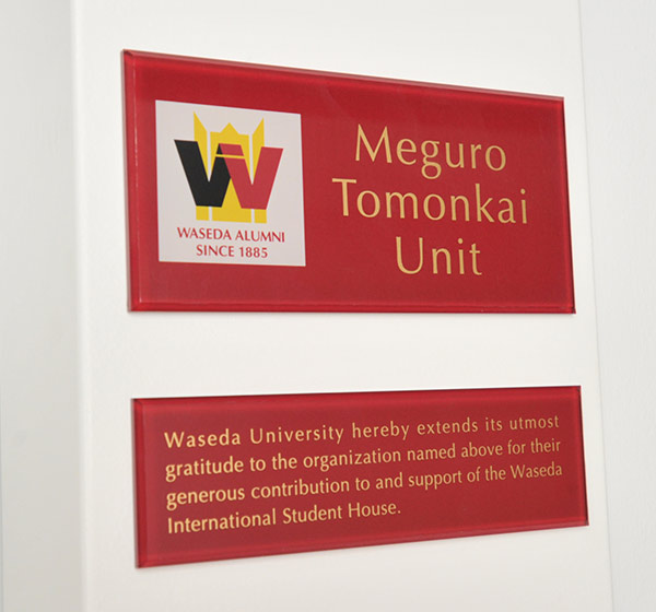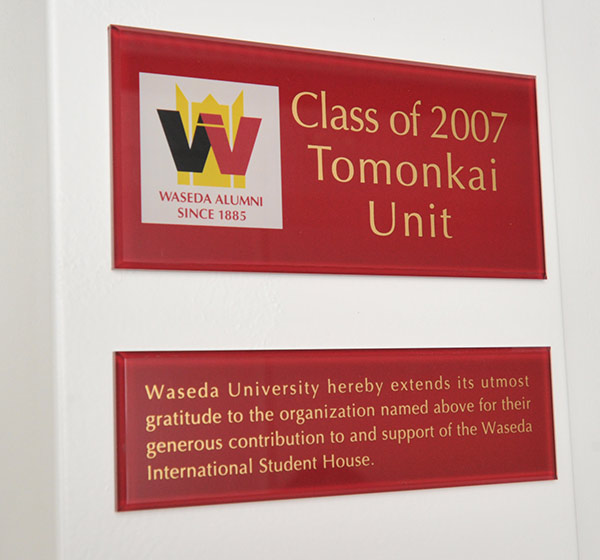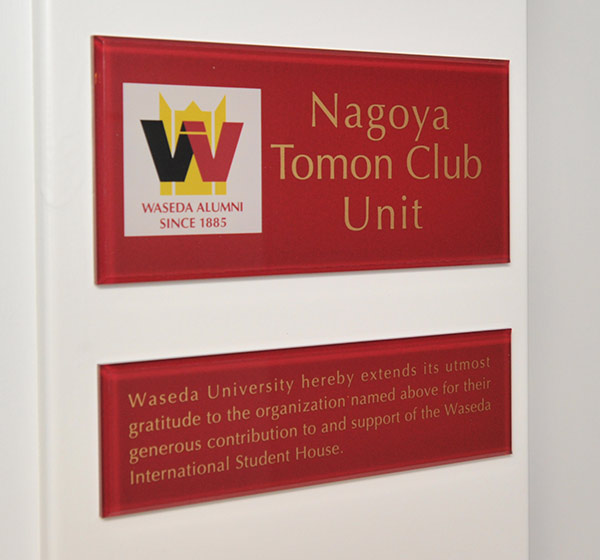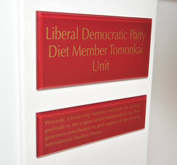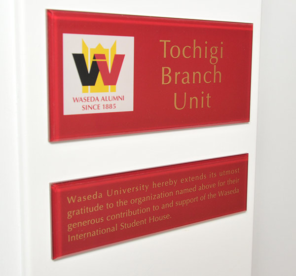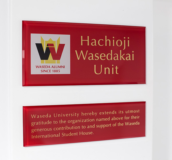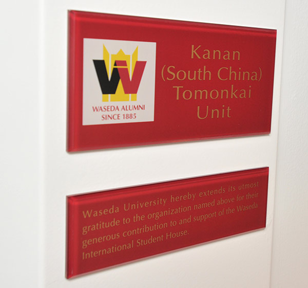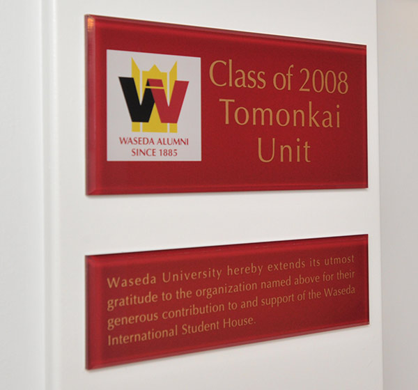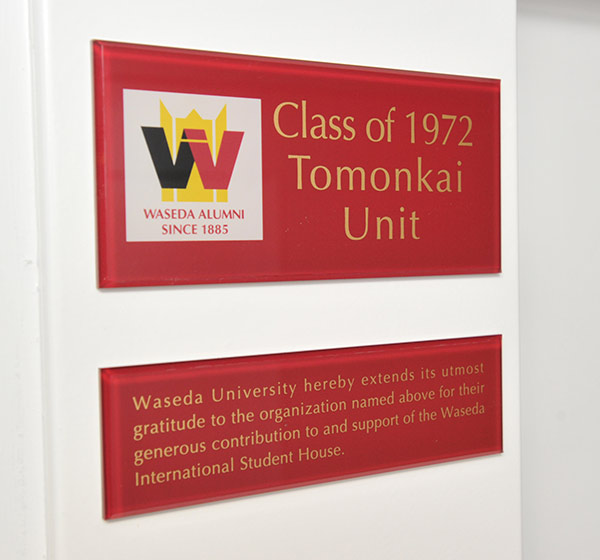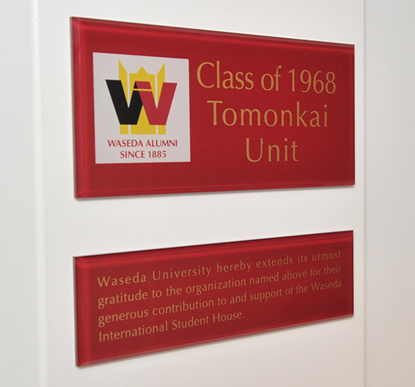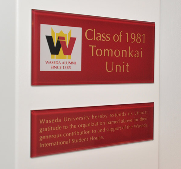 WISHのオープンにあたっては、多くの校友のみなさまに支援をいただきました。ご寄付は寮費を6万3000円から5万3000円へ減額する原資となっています。そうした支援を顕彰すべく、各寮室の入口右柱に記念のプレートを設置しています。プレートは80mm×130mmの透明アクリルガラス製。スクールカラーであるえんじ色の下地に金色で法人、団体、個人名が記されています(国際学生寮のため、英語表記)。
