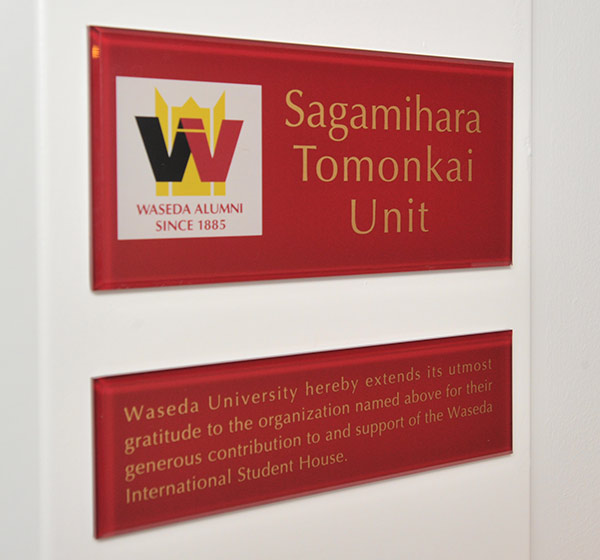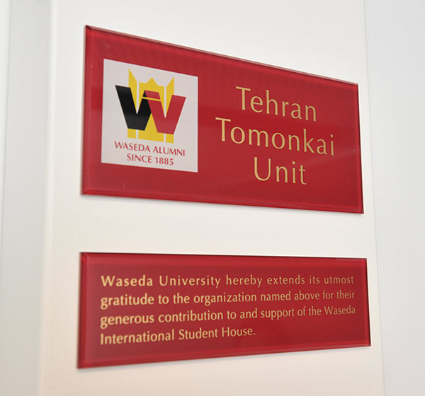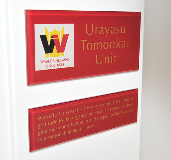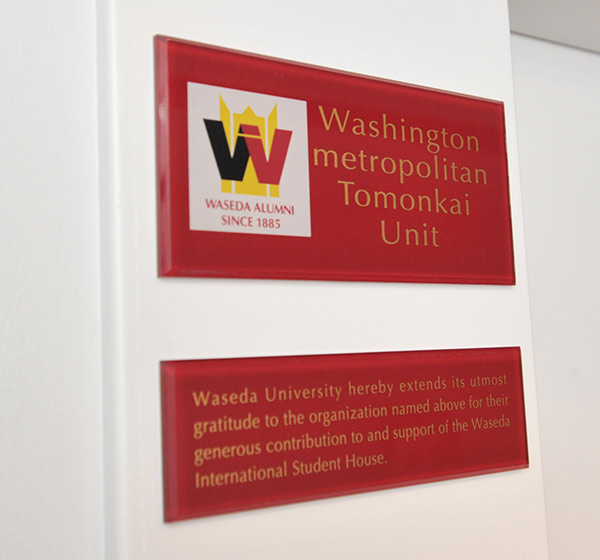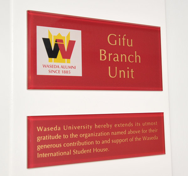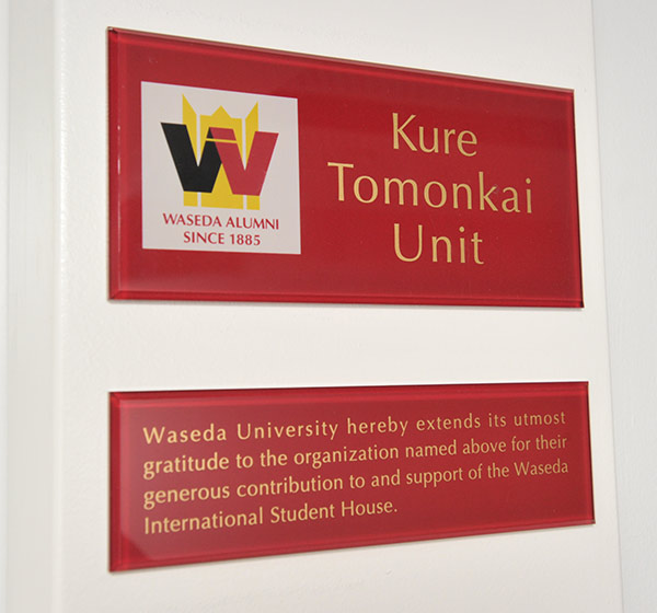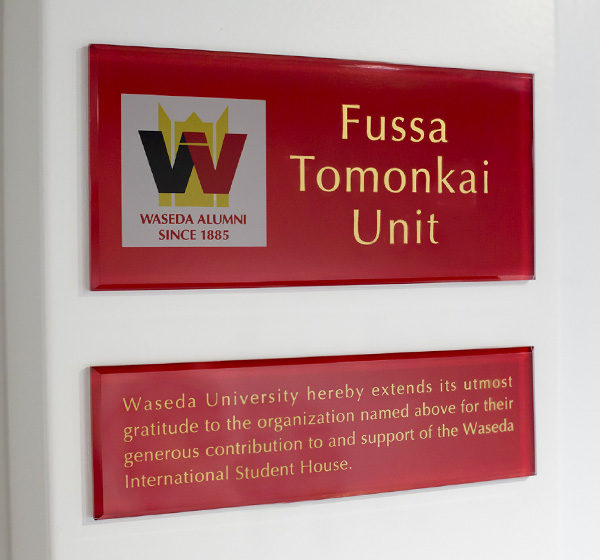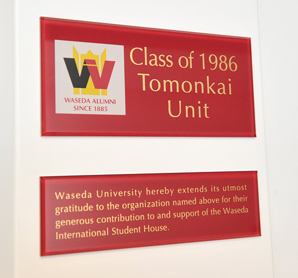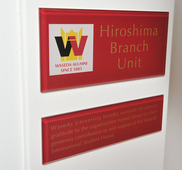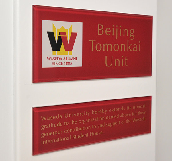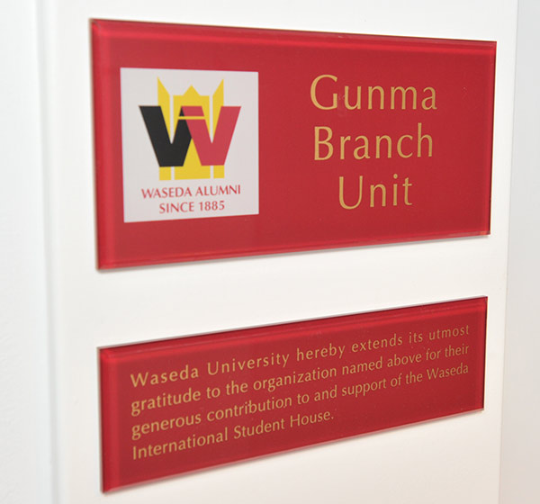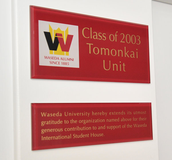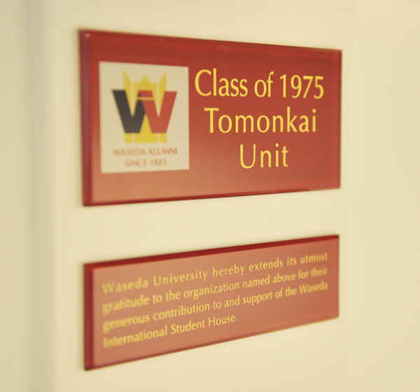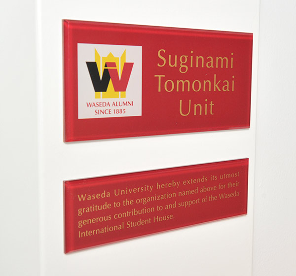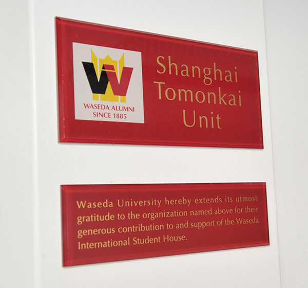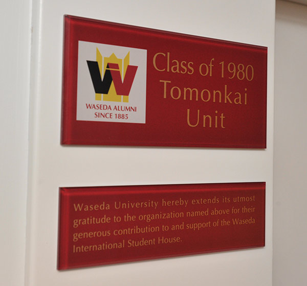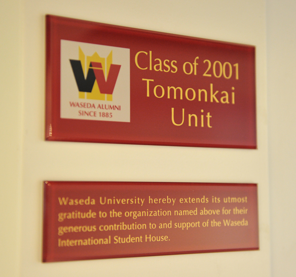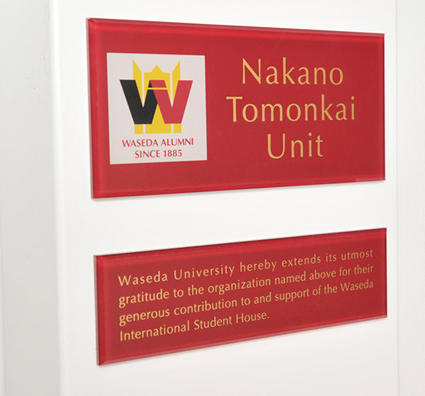 WISHのオープンにあたっては、多くの校友のみなさまに支援をいただきました。ご寄付は寮費を6万3000円から5万3000円へ減額する原資となっています。そうした支援を顕彰すべく、各寮室の入口右柱に記念のプレートを設置しています。プレートは80mm×130mmの透明アクリルガラス製。スクールカラーであるえんじ色の下地に金色で法人、団体、個人名が記されています(国際学生寮のため、英語表記)。
