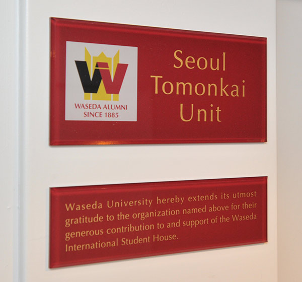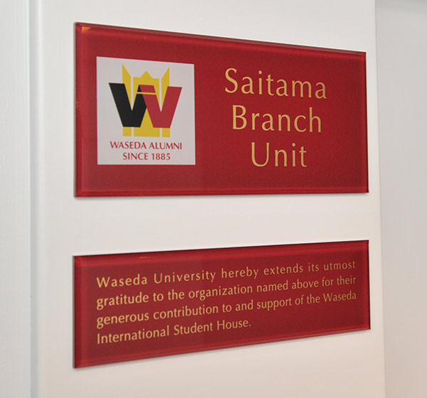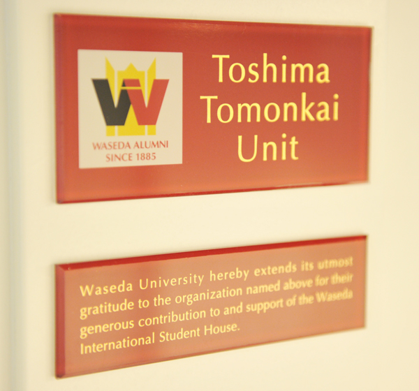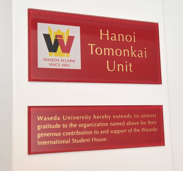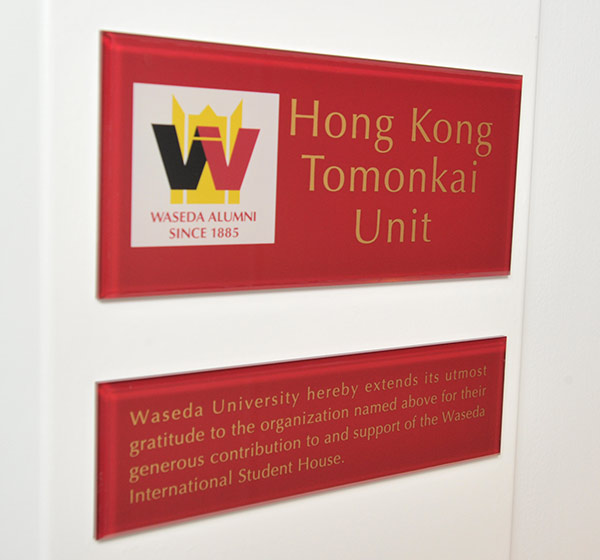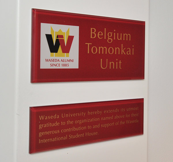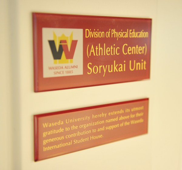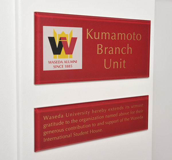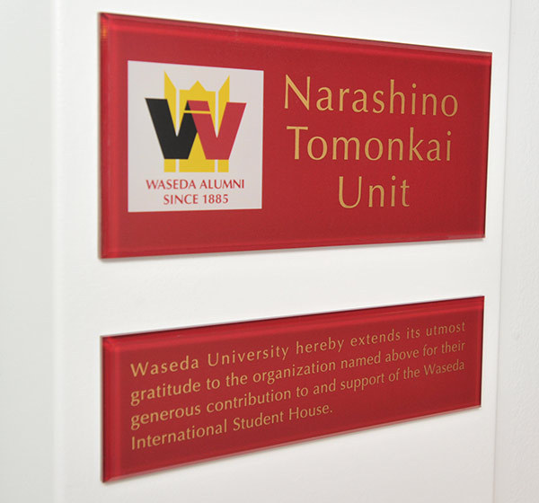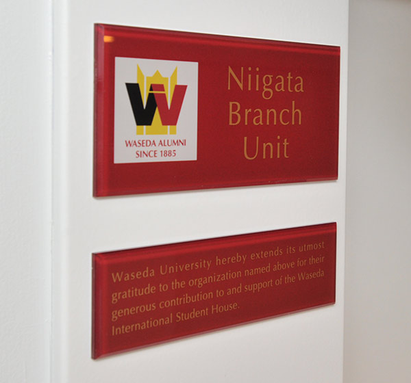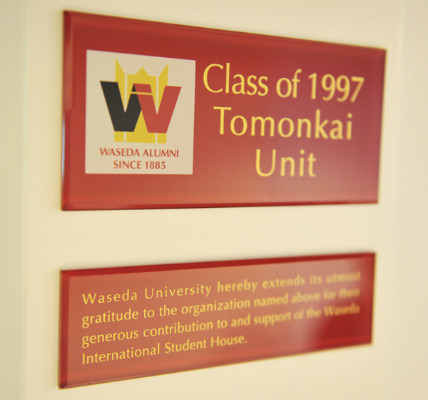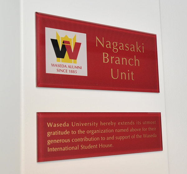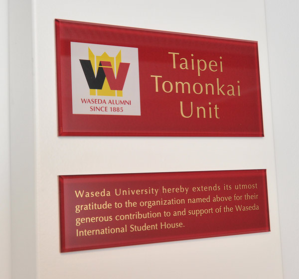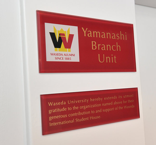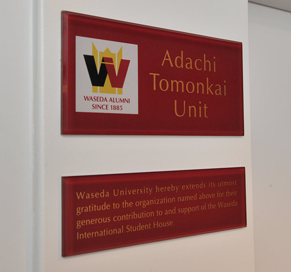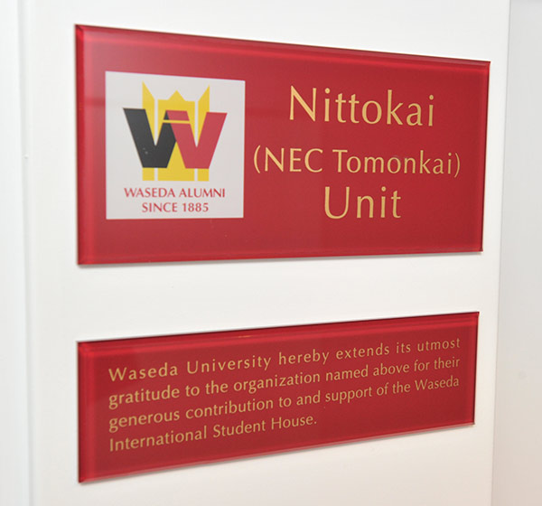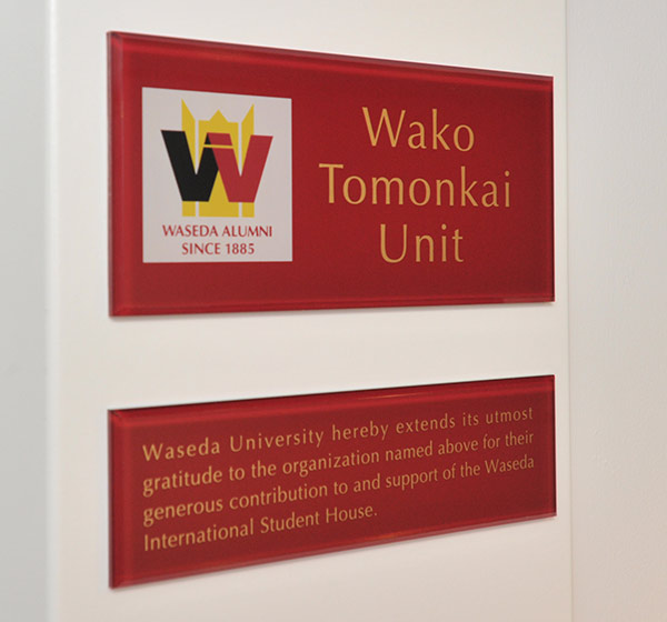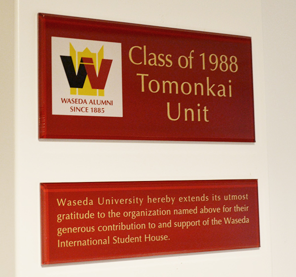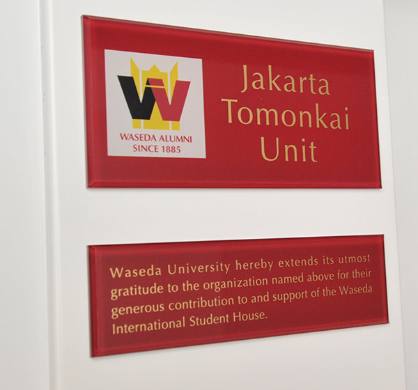 WISHのオープンにあたっては、多くの校友のみなさまに支援をいただきました。ご寄付は寮費を6万3000円から5万3000円へ減額する原資となっています。そうした支援を顕彰すべく、各寮室の入口右柱に記念のプレートを設置しています。プレートは80mm×130mmの透明アクリルガラス製。スクールカラーであるえんじ色の下地に金色で法人、団体、個人名が記されています(国際学生寮のため、英語表記)。