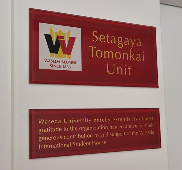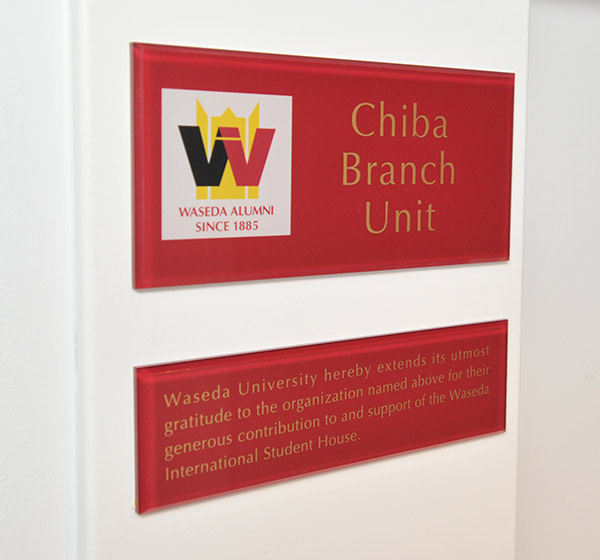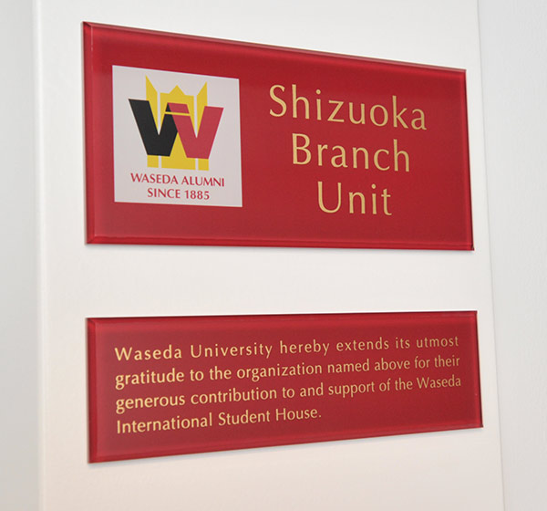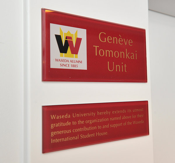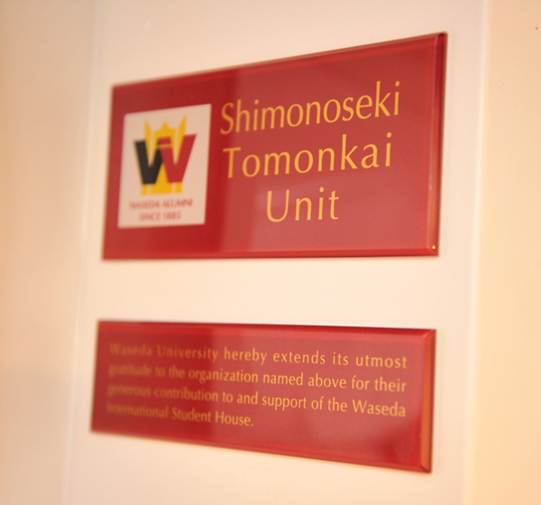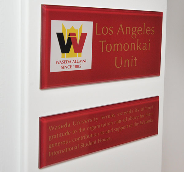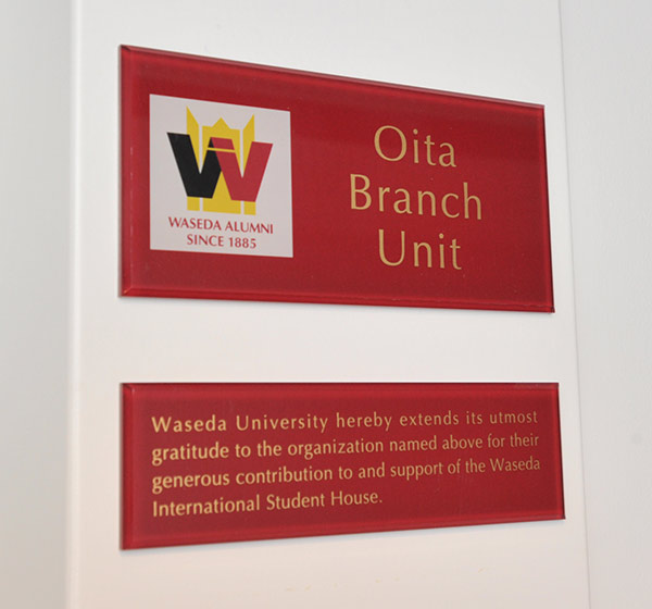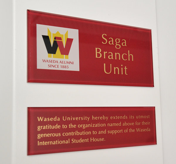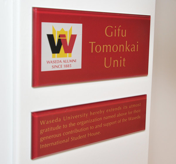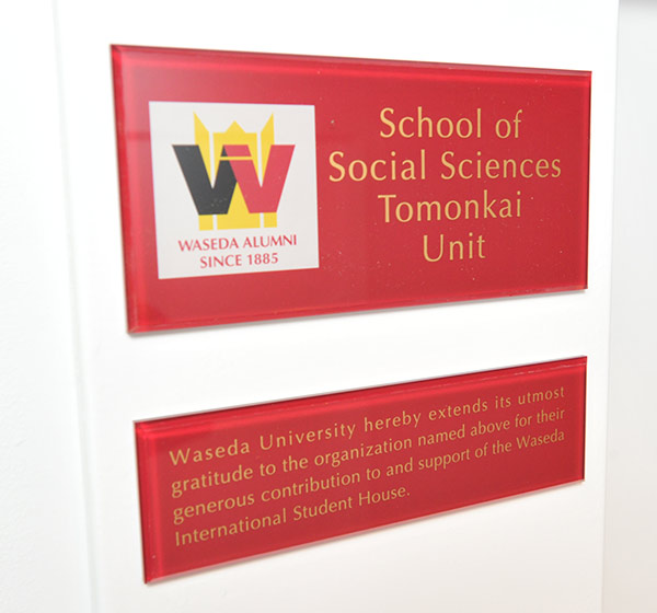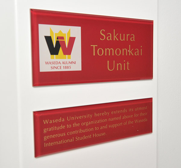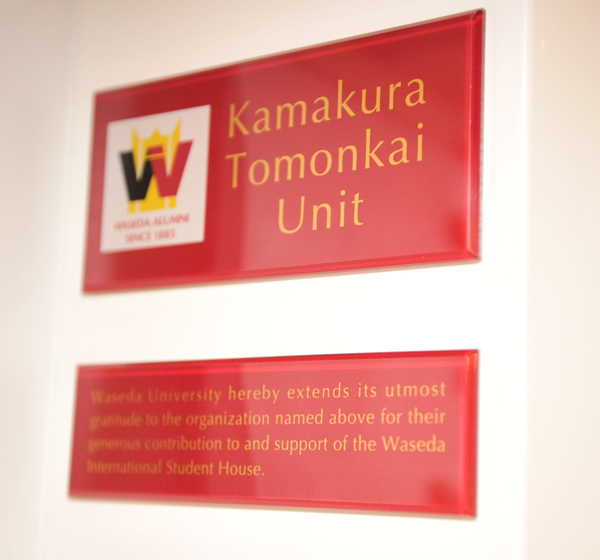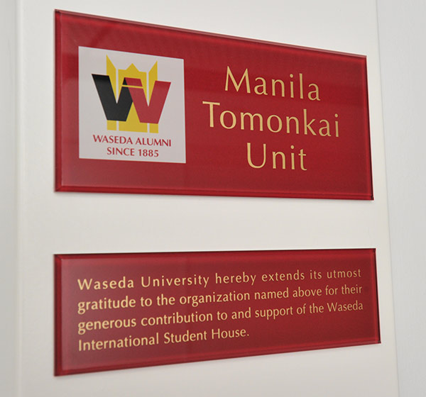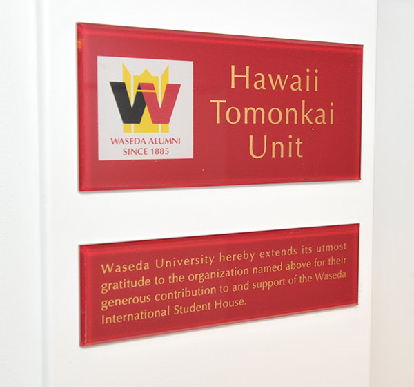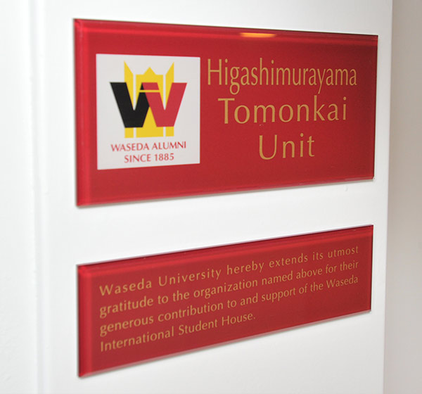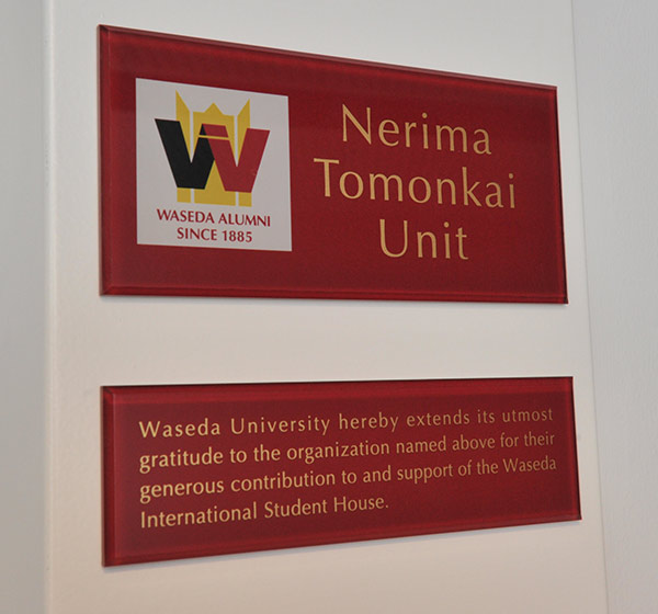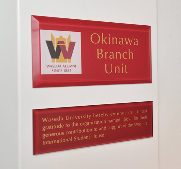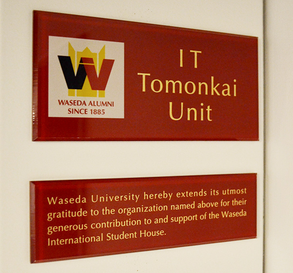 WISHのオープンにあたっては、多くの校友のみなさまに支援をいただきました。ご寄付は寮費を6万3000円から5万3000円へ減額する原資となっています。そうした支援を顕彰すべく、各寮室の入口右柱に記念のプレートを設置しています。プレートは80mm×130mmの透明アクリルガラス製。スクールカラーであるえんじ色の下地に金色で法人、団体、個人名が記されています(国際学生寮のため、英語表記)。