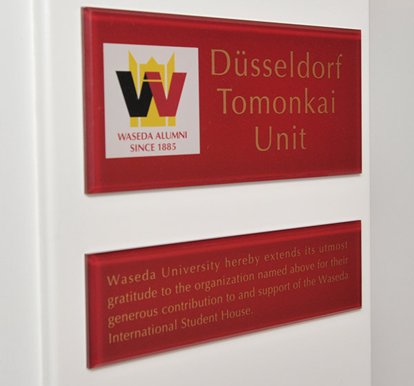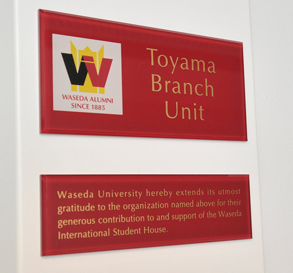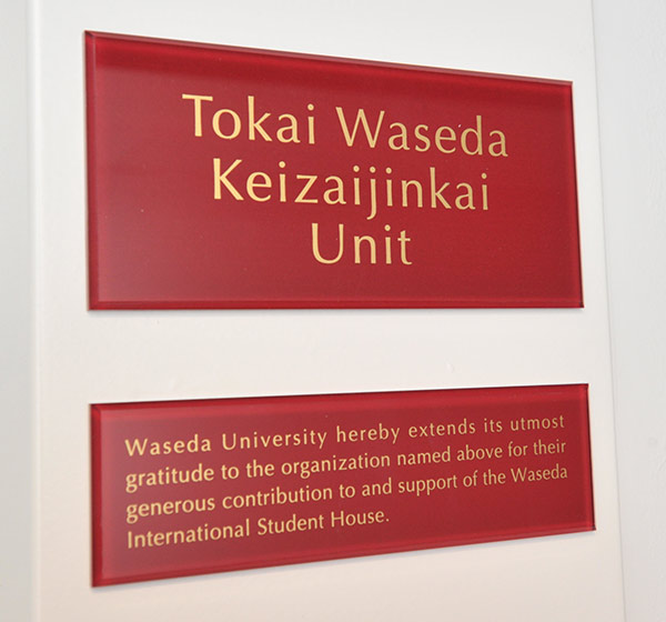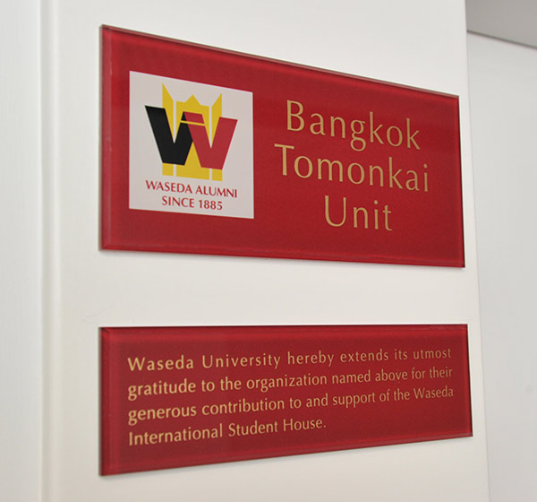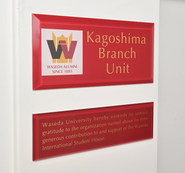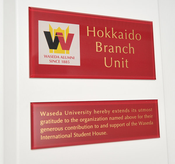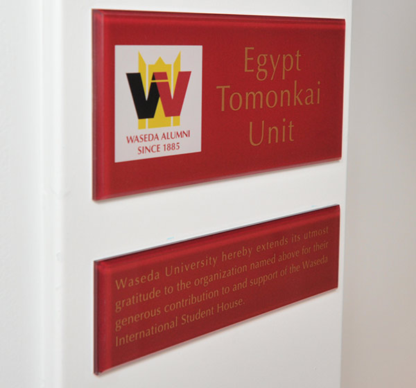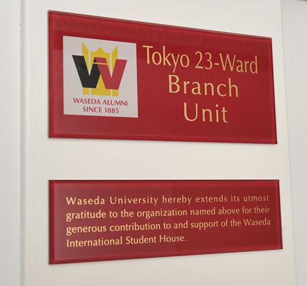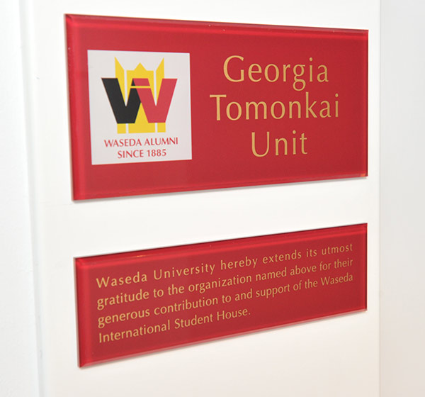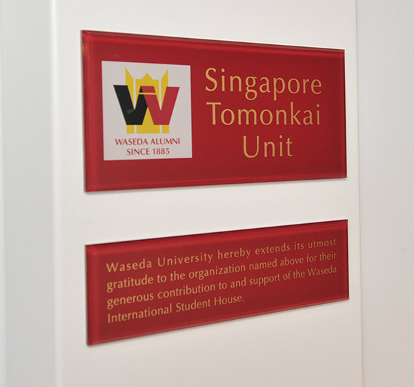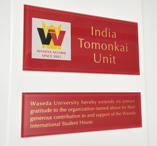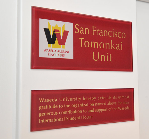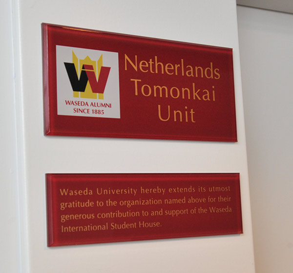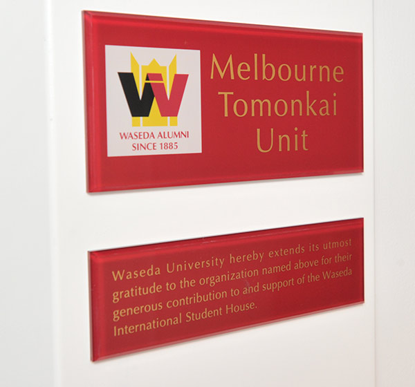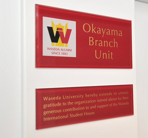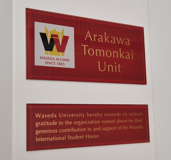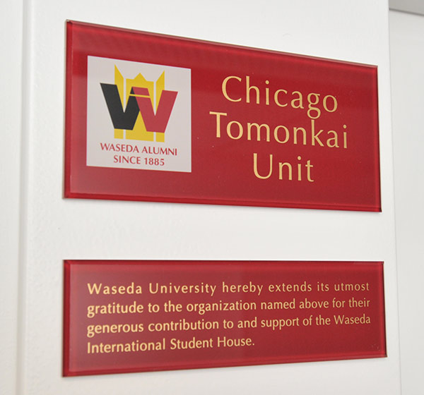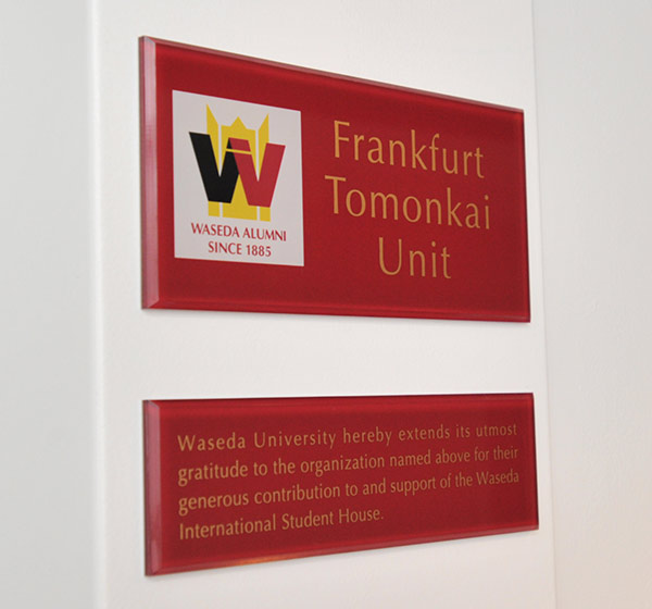 WISHのオープンにあたっては、多くの校友のみなさまに支援をいただきました。ご寄付は寮費を6万3000円から5万3000円へ減額する原資となっています。そうした支援を顕彰すべく、各寮室の入口右柱に記念のプレートを設置しています。プレートは80mm×130mmの透明アクリルガラス製。スクールカラーであるえんじ色の下地に金色で法人、団体、個人名が記されています(国際学生寮のため、英語表記)。