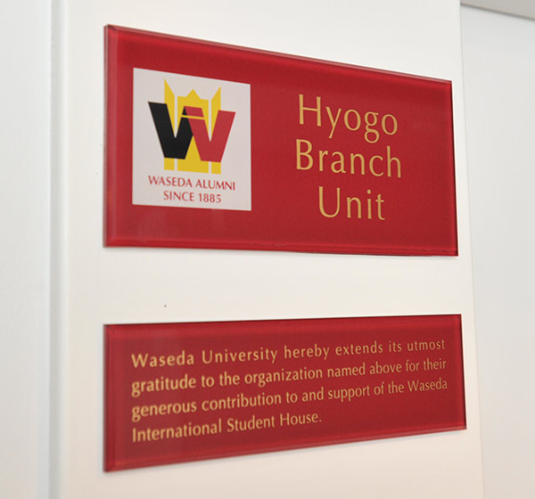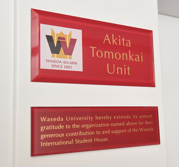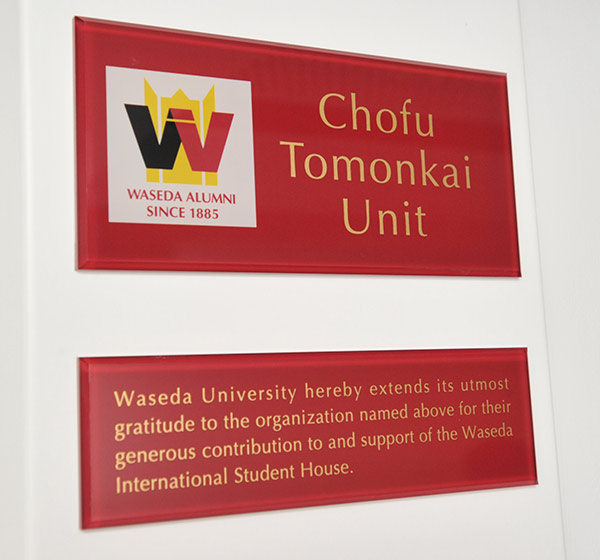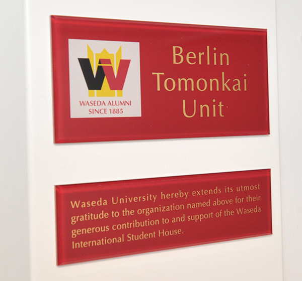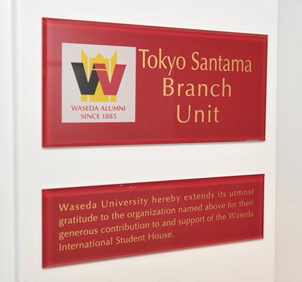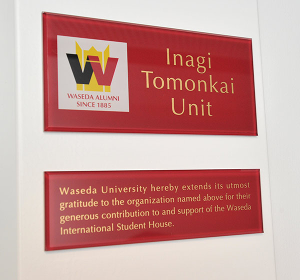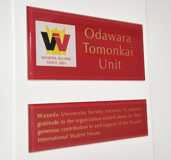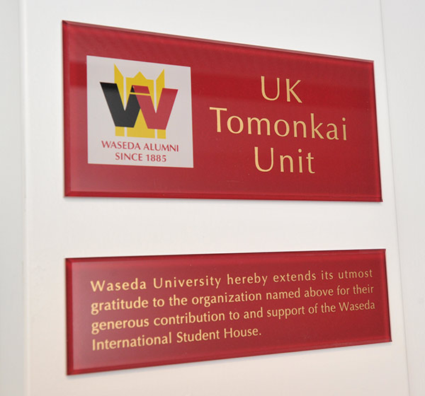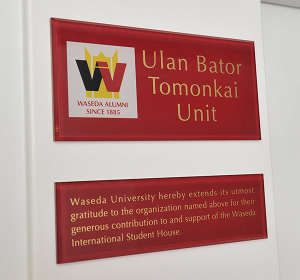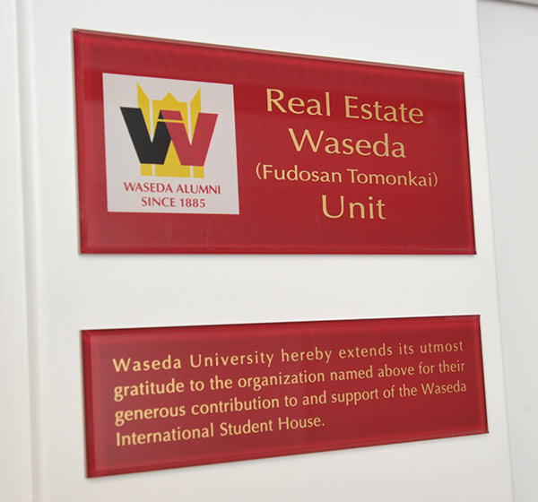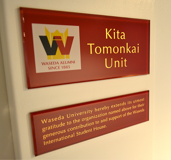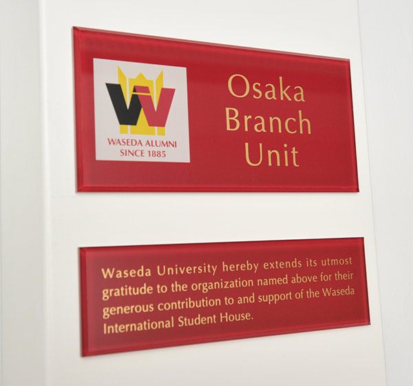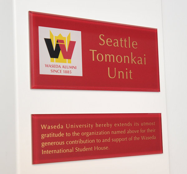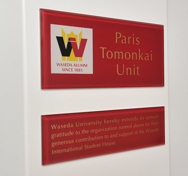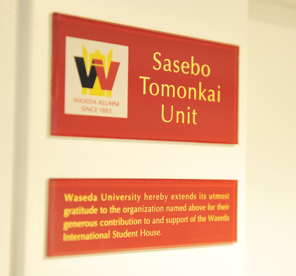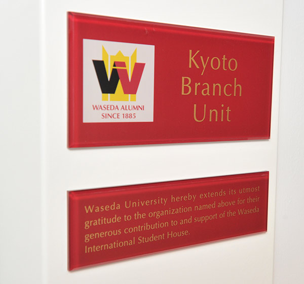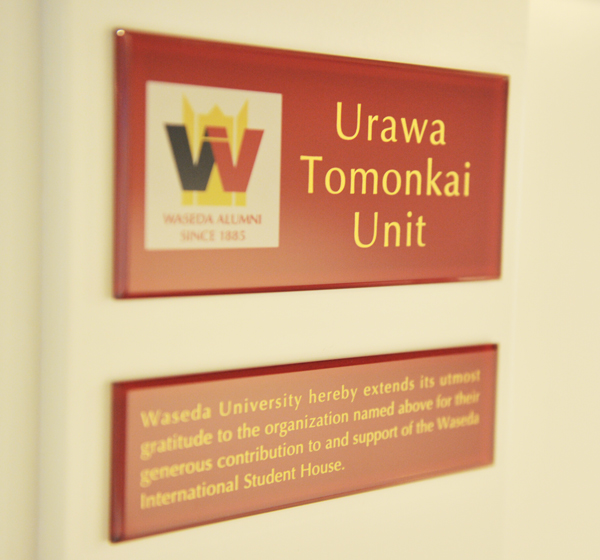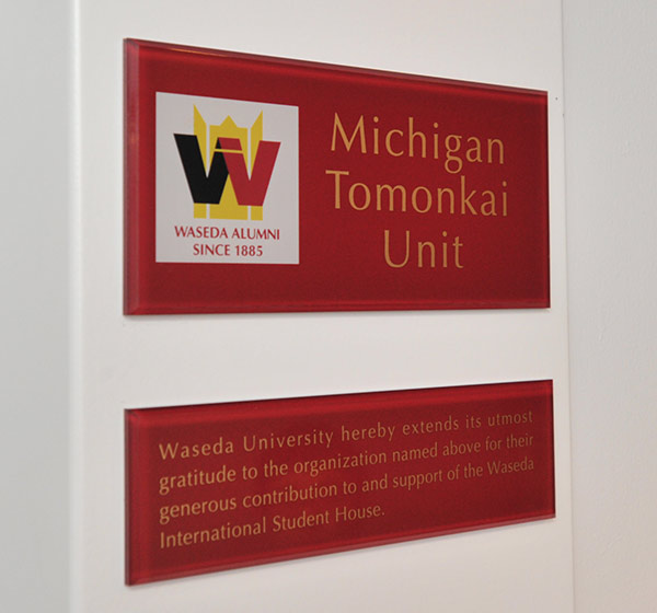 WISHのオープンにあたっては、多くの校友のみなさまに支援をいただきました。ご寄付は寮費を6万3000円から5万3000円へ減額する原資となっています。そうした支援を顕彰すべく、各寮室の入口右柱に記念のプレートを設置しています。プレートは80mm×130mmの透明アクリルガラス製。スクールカラーであるえんじ色の下地に金色で法人、団体、個人名が記されています(国際学生寮のため、英語表記)。