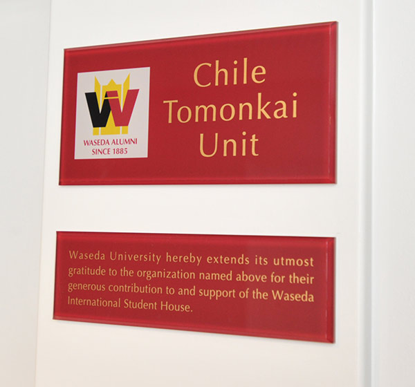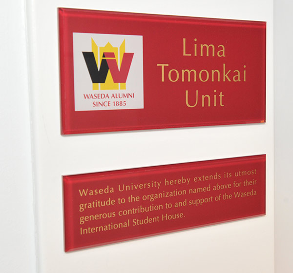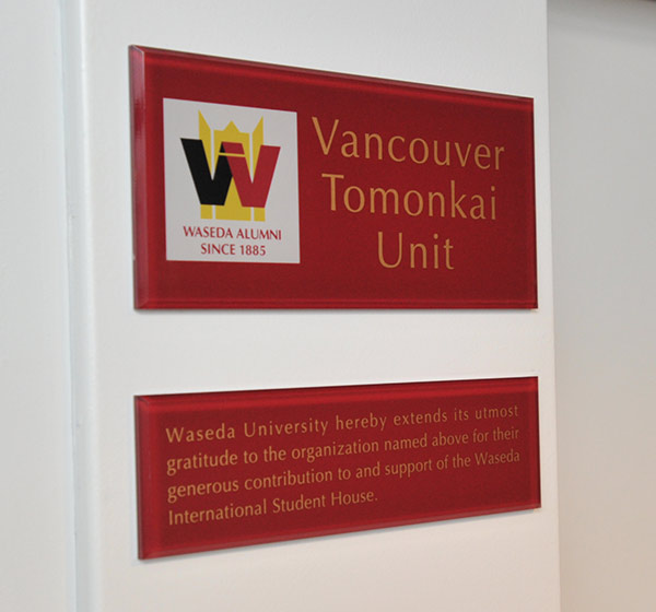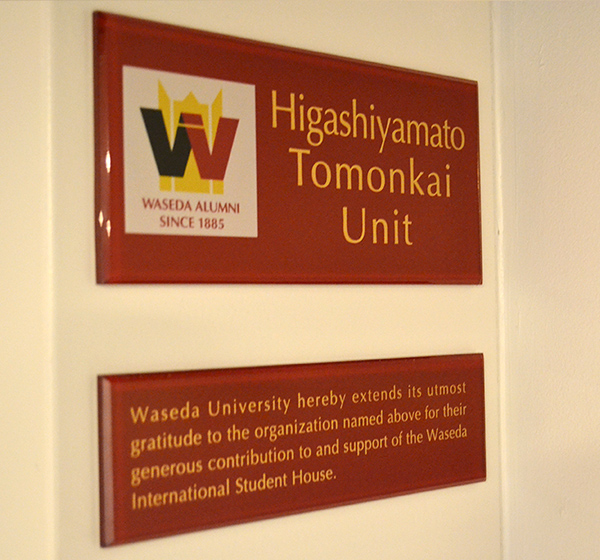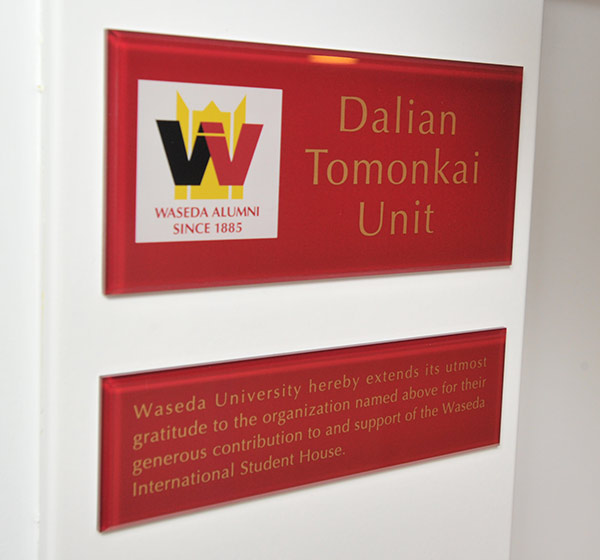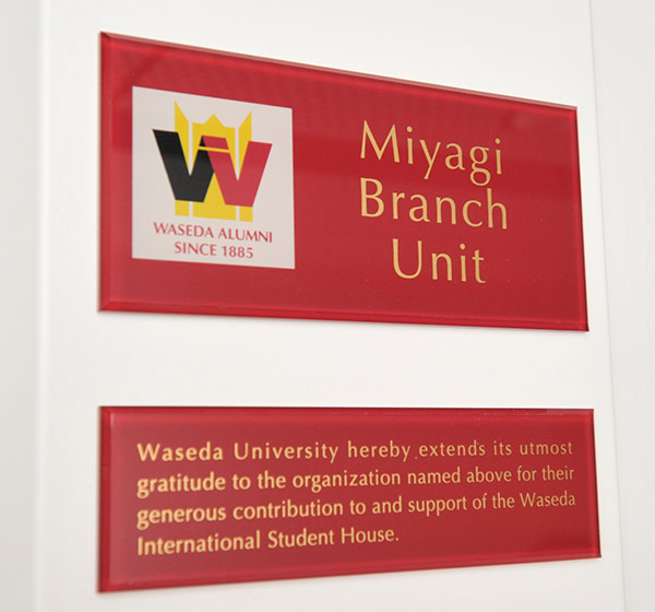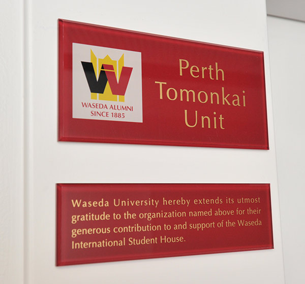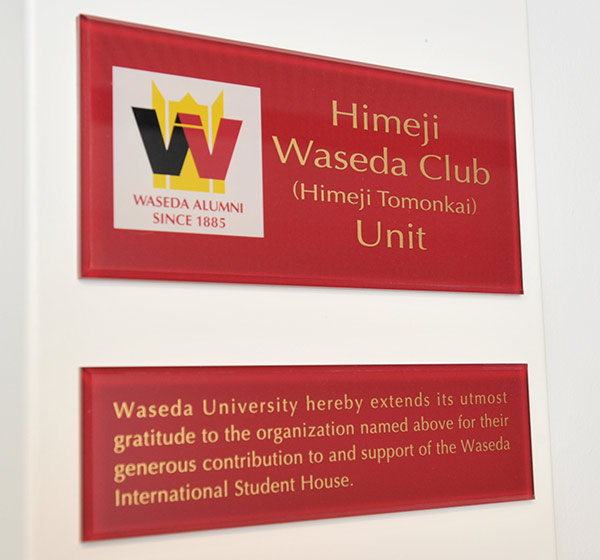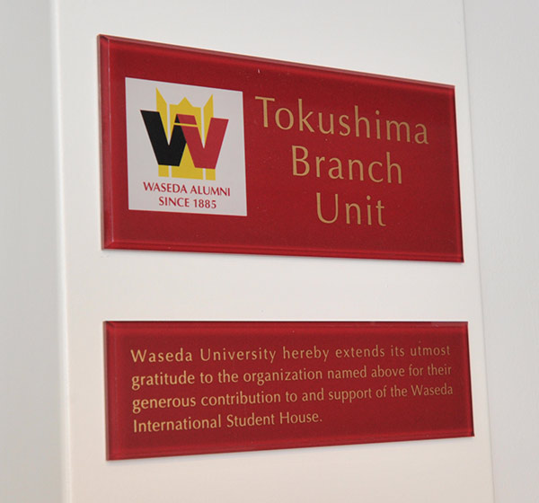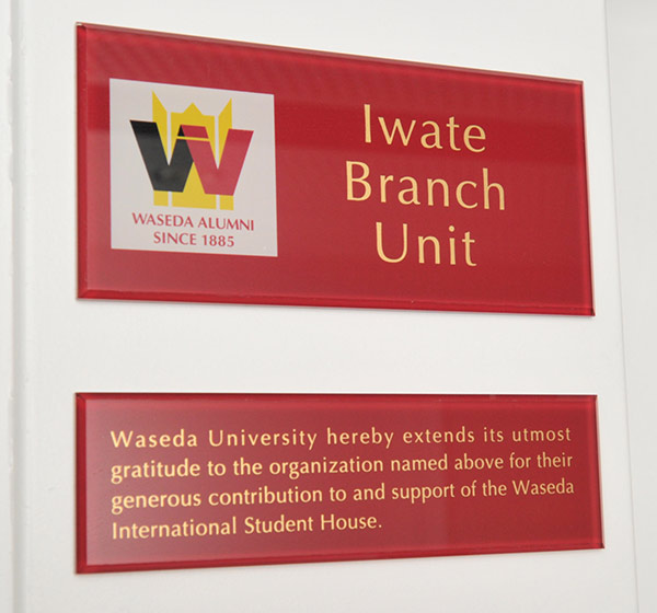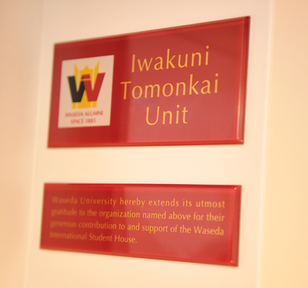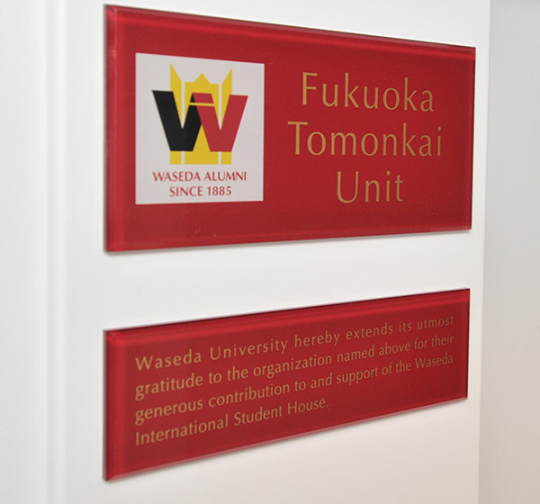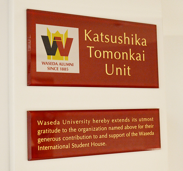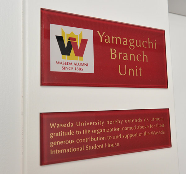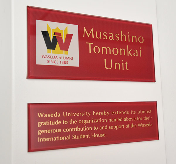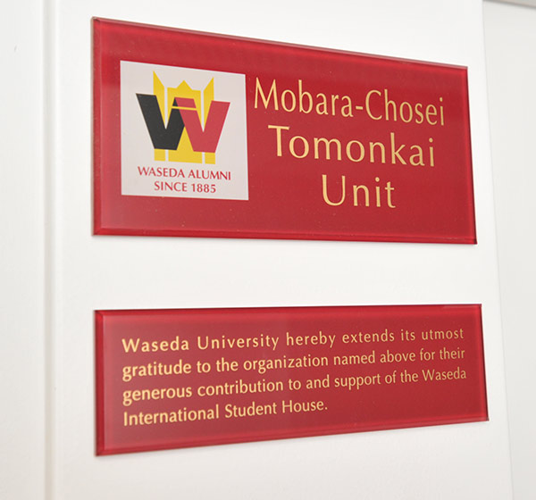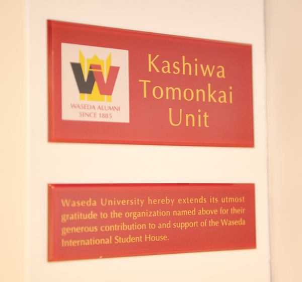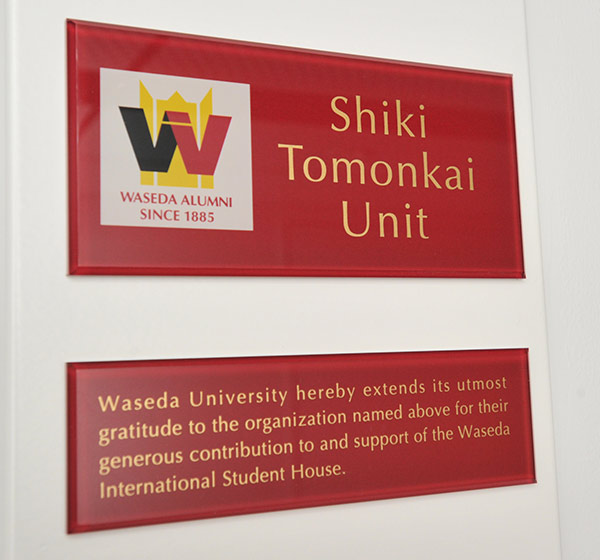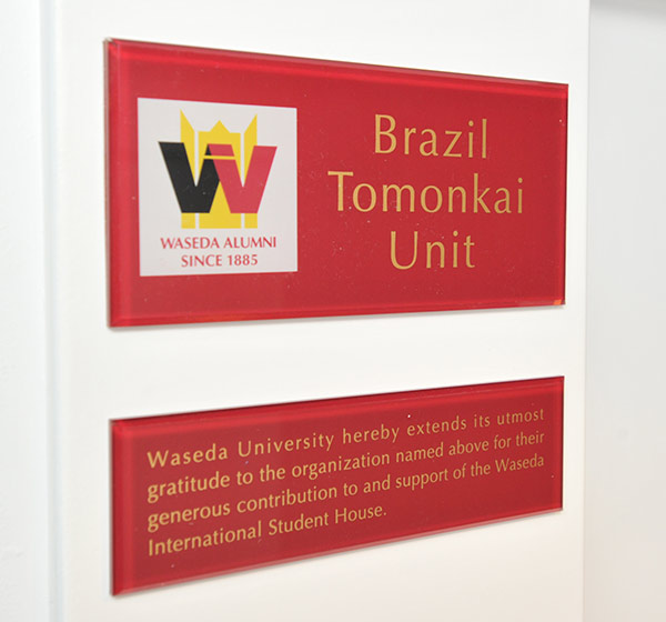WISHのオープンにあたっては、多くの校友のみなさまに支援をいただきました。ご寄付は寮費を6万3000円から5万3000円へ減額する原資となっています。そうした支援を顕彰すべく、各寮室の入口右柱に記念のプレートを設置しています。プレートは80mm×130mmの透明アクリルガラス製。スクールカラーであるえんじ色の下地に金色で法人、団体、個人名が記されています(国際学生寮のため、英語表記)。