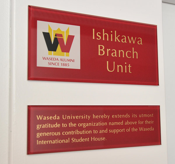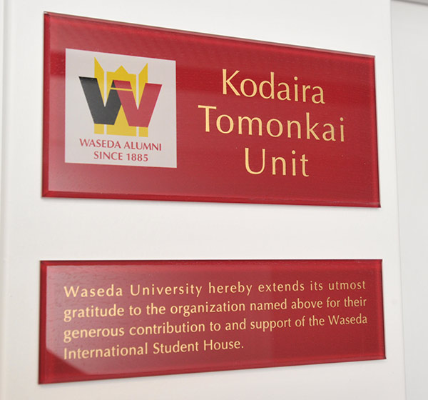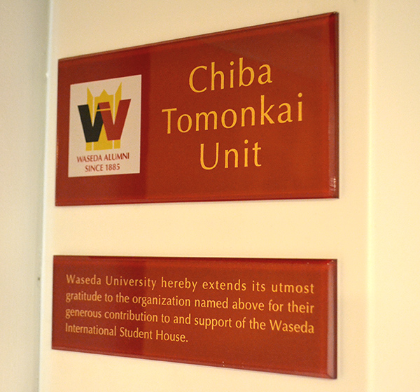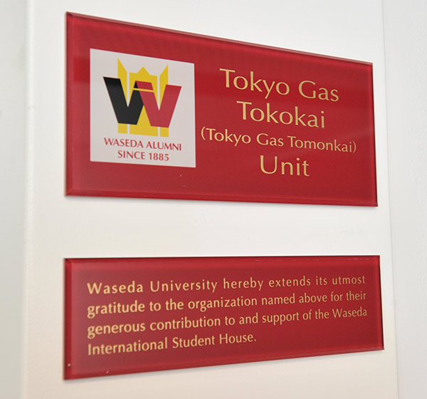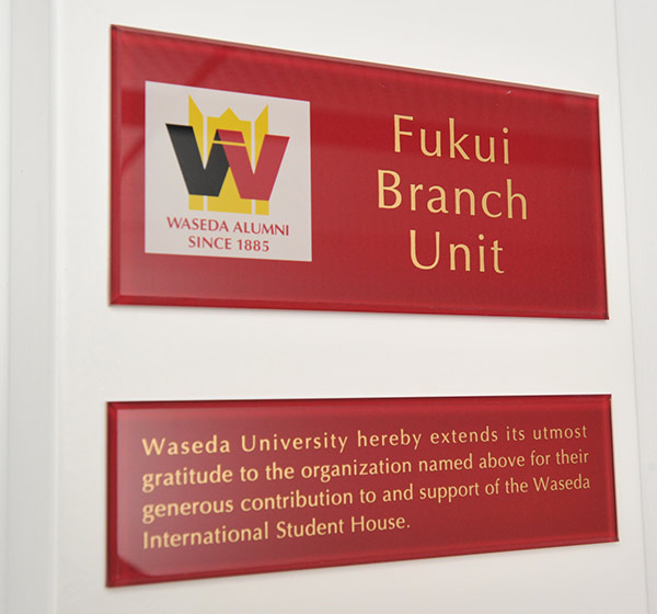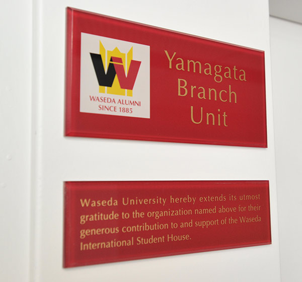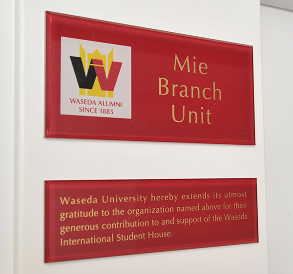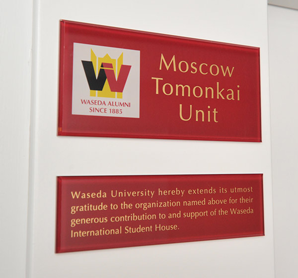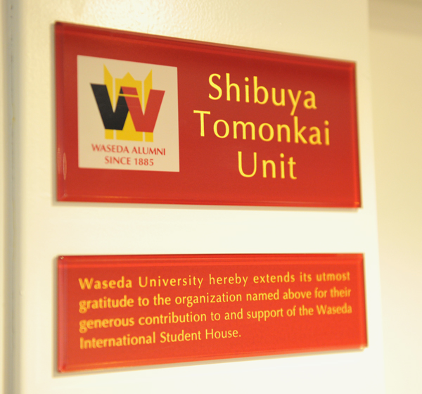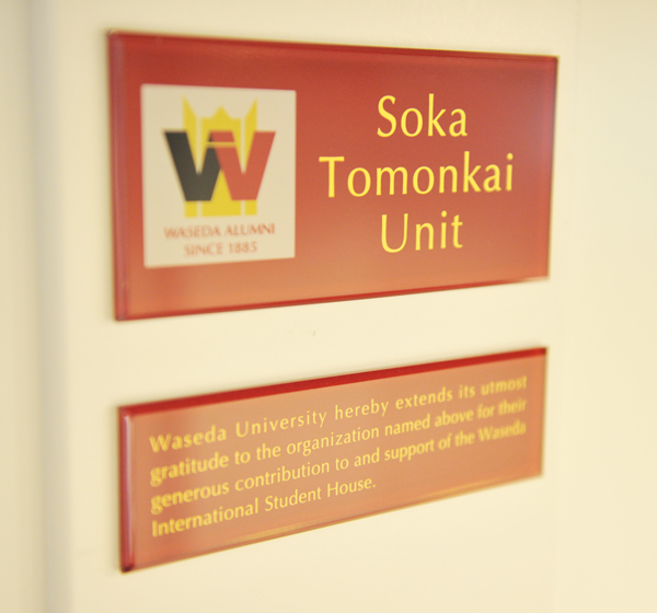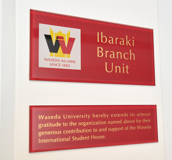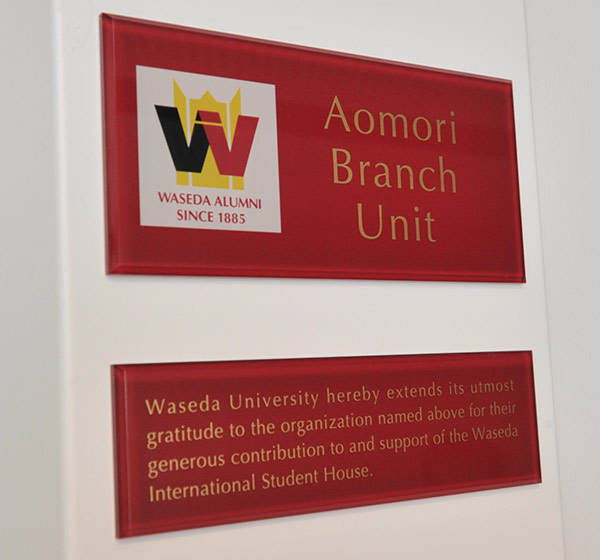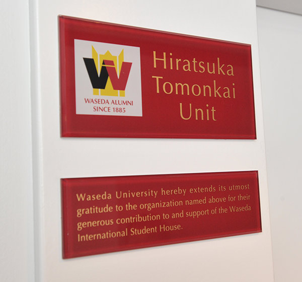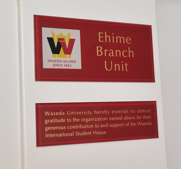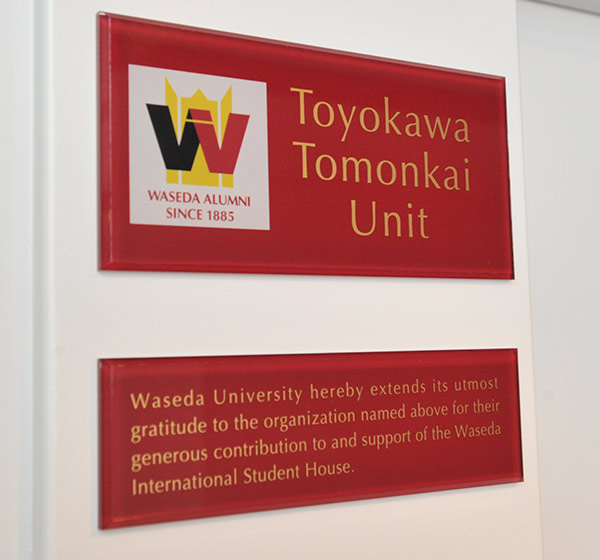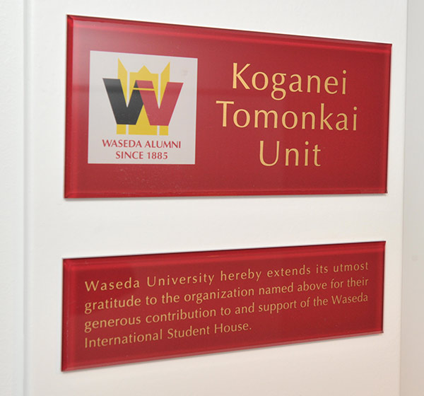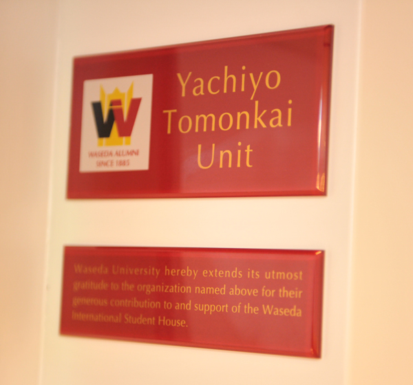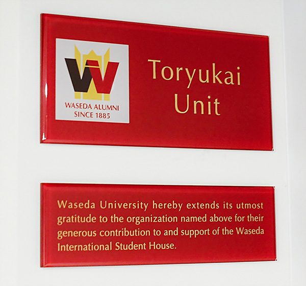 WISHのオープンにあたっては、多くの校友のみなさまに支援をいただきました。ご寄付は寮費を6万3000円から5万3000円へ減額する原資となっています。そうした支援を顕彰すべく、各寮室の入口右柱に記念のプレートを設置しています。プレートは80mm×130mmの透明アクリルガラス製。スクールカラーであるえんじ色の下地に金色で法人、団体、個人名が記されています(国際学生寮のため、英語表記)。