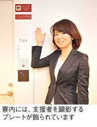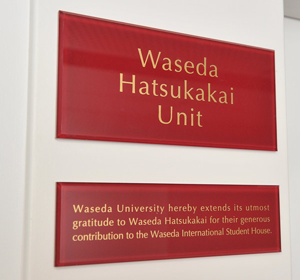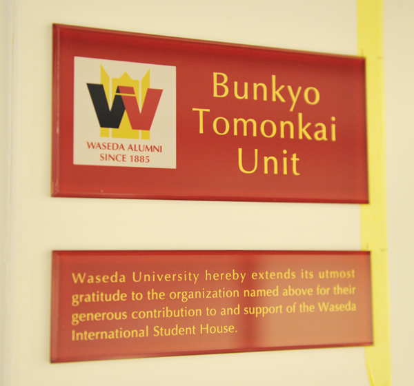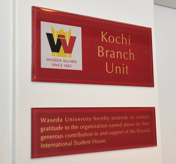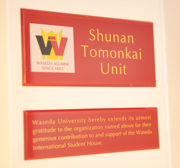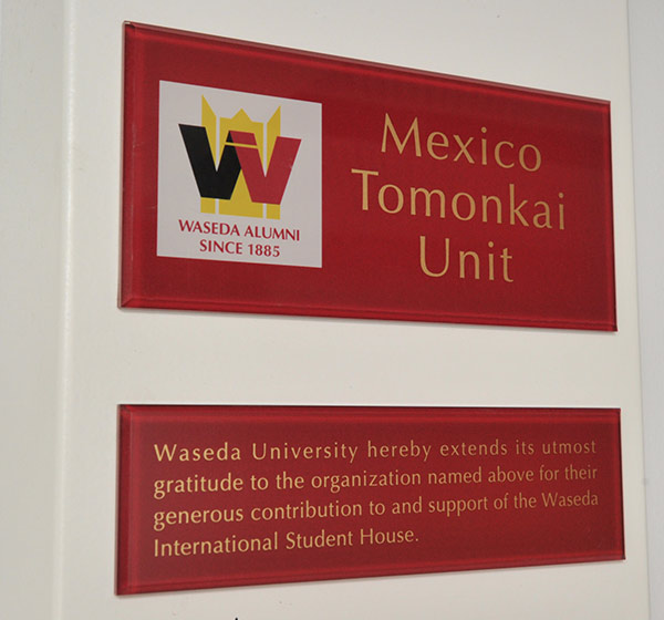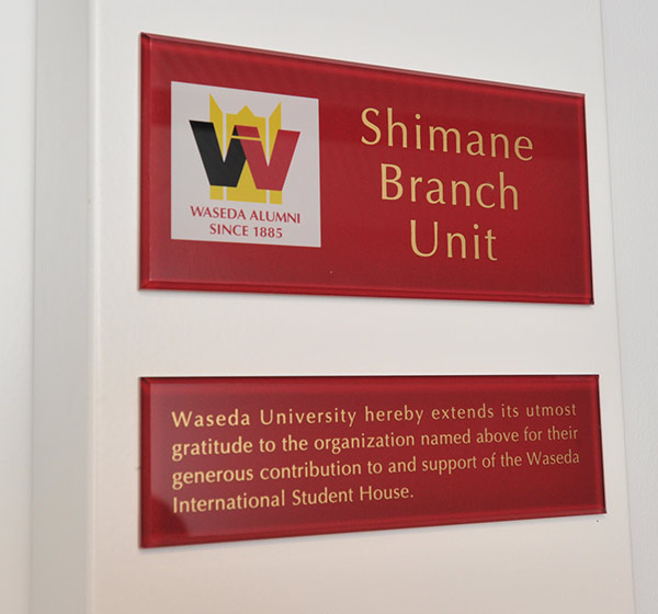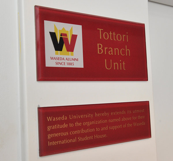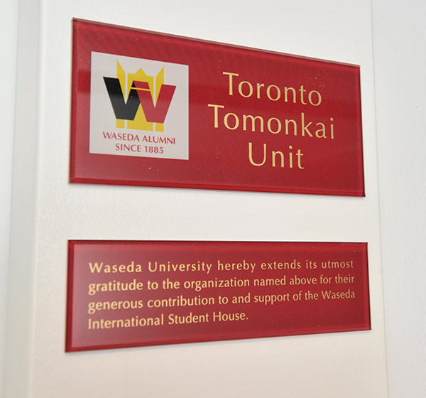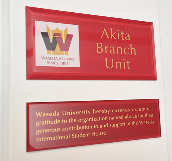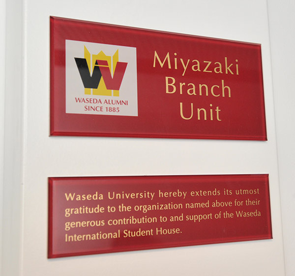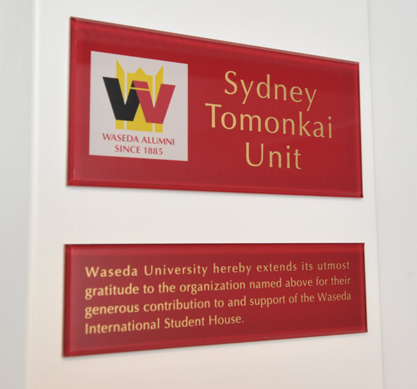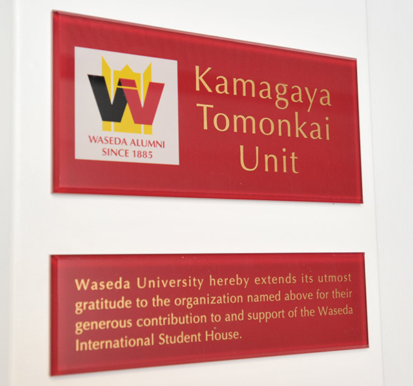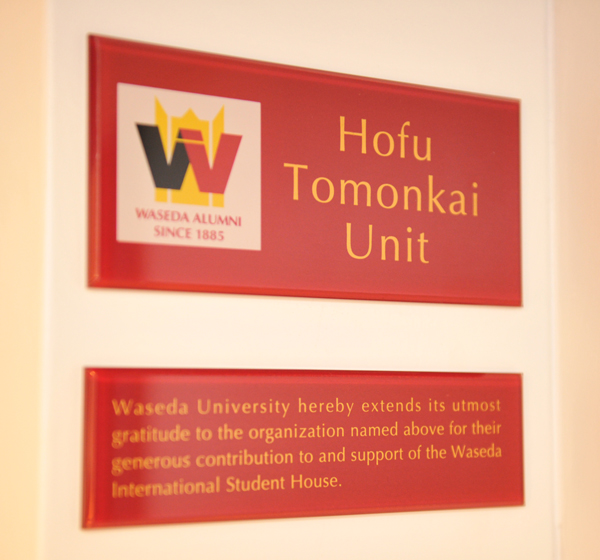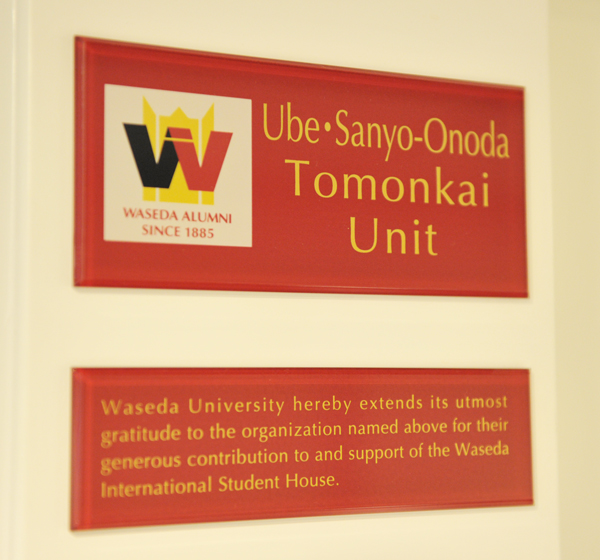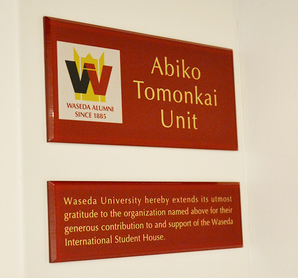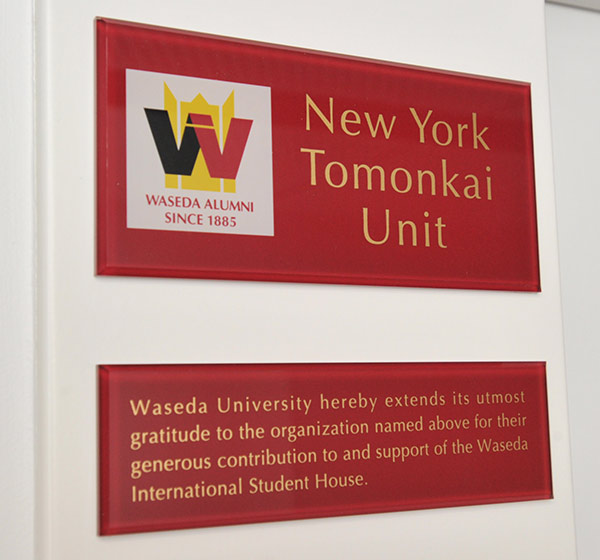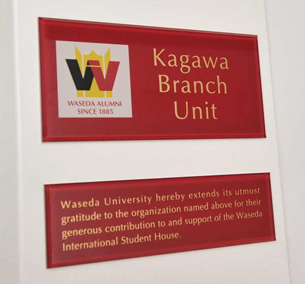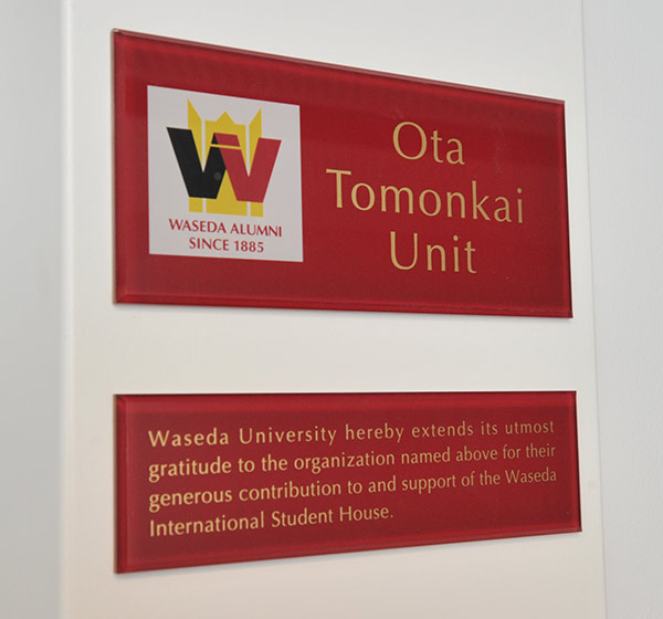 WISHのオープンにあたっては、多くの校友のみなさまに支援をいただきました。ご寄付は寮費を6万3000円から5万3000円へ減額する原資となっています。そうした支援を顕彰すべく、各寮室の入口右柱に記念のプレートを設置しています。プレートは80mm×130mmの透明アクリルガラス製。スクールカラーであるえんじ色の下地に金色で法人、団体、個人名が記されています(国際学生寮のため、英語表記)。