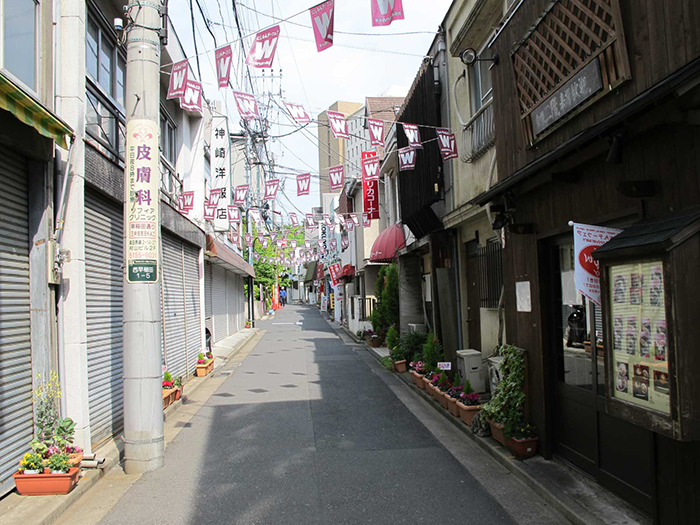 左奥から、医療器具卸のイシバシ、珍味、カレーのフジ、神崎洋服店。右手前にはトンカツのフクちゃん。全てがこの画角に揃っていた。今はイシバシさんが大幅に拡張。