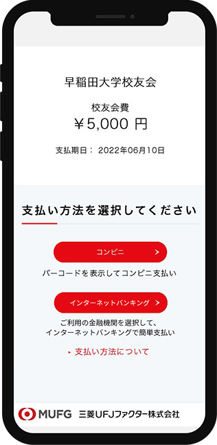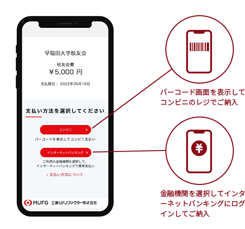 スマートフォン(以下、スマホ)を利用して、コンビニエンスストア、金融機関のインターネットバンキングで校友会費をご納入いただけます。