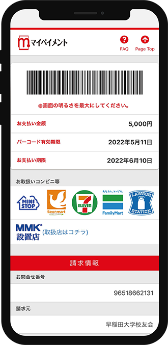 コンビニ納入の場合、スマホ画面にバーコードを表示し、コンビニレジにてご納入いただけます。