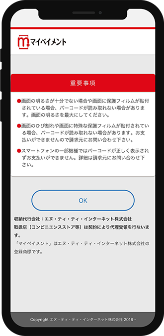 - ・コンビニボタンをタップすると、マイペイメント重要事項が表示されるので、内容を確認の上、OK ボタンをタップします。