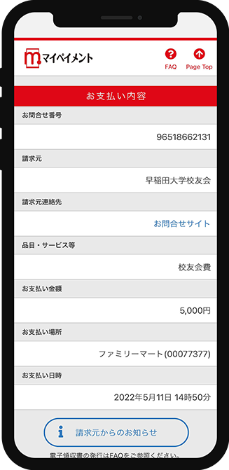 - ・ご納入が完了すると、「請求内容表示」画面に「支払いが完了しております」と表示され、コンビニボタンが「支払状況の確認」ボタンになります。