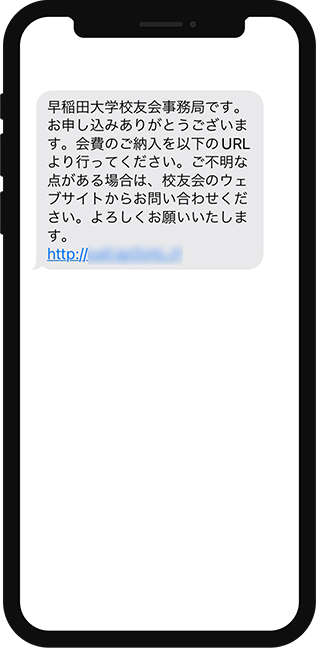 - ・校友会ウェブサイトのお申し込みフォーム校友会ウェブサイトのお申し込みフォームからお申し込みいただくと、送信先のスマホに、URL 付のSMS が送信されます(SMS のイメージは、スマホの機種によって異なります)。