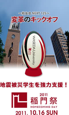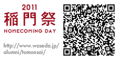 | 2011.5.12 | 稲門祭当日、同窓会集合場所を提供いたします。早稲田キャンパスで旧交を温めてください。サイト、もしくは郵送でお申し込みいただけます。 |