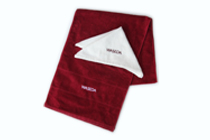 100年以上の伝統を誇る愛媛県今治市で生産された最高品質の生地を利用したタオルマフラーとハンカチのセット。タオルマフラー サイズ:幅25cm×長さ120cm(エンジ地に白の刺繍)、タオルハンカチ サイズ:25cm四方(白地にエンジの刺繍)