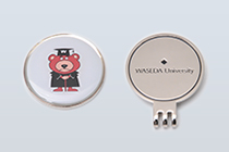 「WASEDA University」を刻印したメタリックシルバーのマグネットクリップと、おなじみのワセダベアをあしらったゴルフマーカーのセットです。