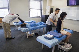 「へそヒーリング」とは、へそというボタンを活用した健康法です。マットに横になっていただき、専用のヒーリングバーでおへそとその周りのおなかの部分を中心に10分間マッサージします。また「ソーラーボディ体操」とは、お皿を手に持ったまま腕を伸ばして全身を回転させる免疫力アップ体操です。施術は10分間で各500円です。