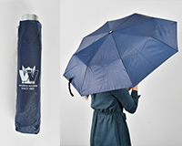 親骨8本の丈夫なポリエステル製の折り畳み傘。使う人を選ばないベーシックなデザイン。袋は校友会のロゴ入りです。