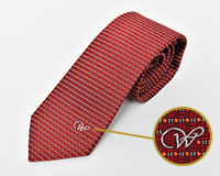 エンジ色をベースにしたストライプ風にみえる、おしゃれな小柄の模様(地紋)入りネクタイです。おなじみの「W」マーク入り。ビジネスからカジュアルまで幅広くお使いいただけます。